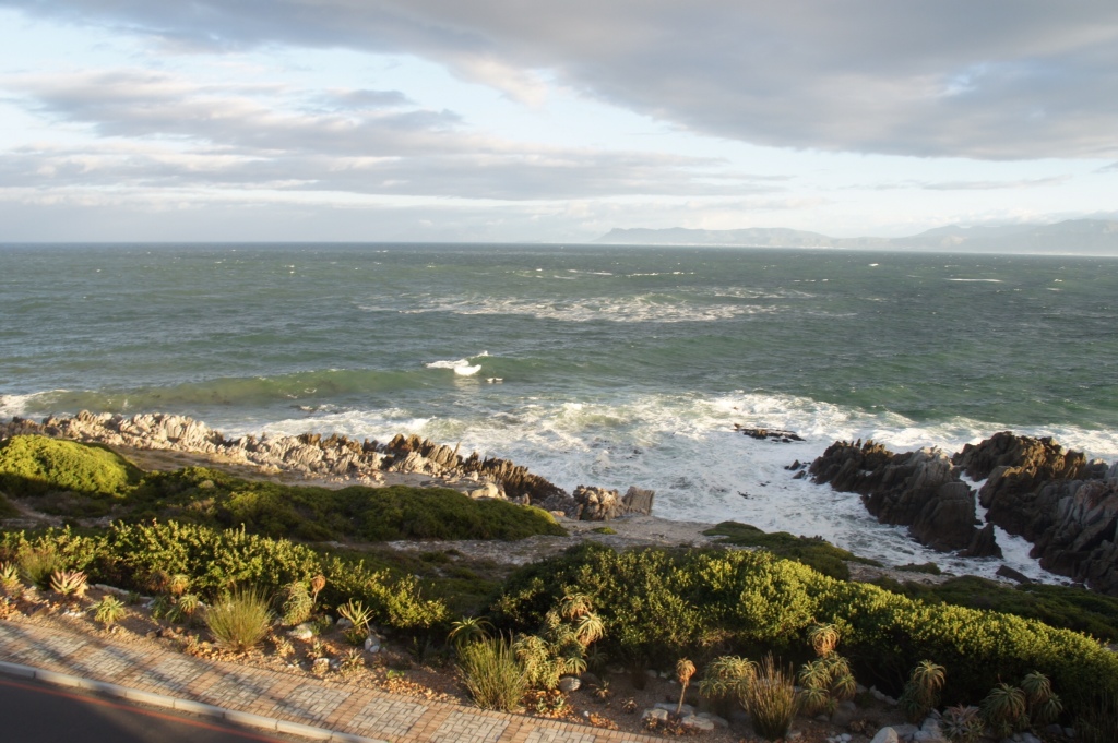 Nach dem aufregenden gestrigen Tag wollten wir es heute auch gern eine Nummer kleiner, sowohl hinsichtlich des Transportmittels (Auto statt Speedboat) als auch bei den Tieren (Haifutter/Pinguine statt selbst Haifutter sein). Wir wurden am Morgen von einem wild tosenden Atlantik unmittelbar vor unserem Fenster geweckt. Die Brandung rollte stark gegen die Klippen von de Kelder und unser Heim auf Zeit krächzte bei jeder Windböe. Das Meer war tiefblau und schaumweiss, wenn die Wellen über den Strand schwappten. Dass Lainny und Stan, unsere Gastgeber in der Whalesong Lodge keinen Fernseher brauchen ist klar, jeder Tag ist anders und bietet vor der grossen Fensterfront Besseres, als man je in der Flimmerkiste zu sehen bekommt. Die Lodge ist im übrigen sehr empfehlenswert .. Beide sind sehr freundliche Gastgeber (gebürtig aus Namibia, so dass Stan sehr gut deutsch spricht), geben einem gute Tipps und geniessen ebenfalls gutes Essen – selbst zubereitet oder im guten Restaurant. Die Lodge war angenehm mit der richtigen Dosis Kunst, Schnickschnack und vielen oft genutzten Kochbüchern ausgestattet.