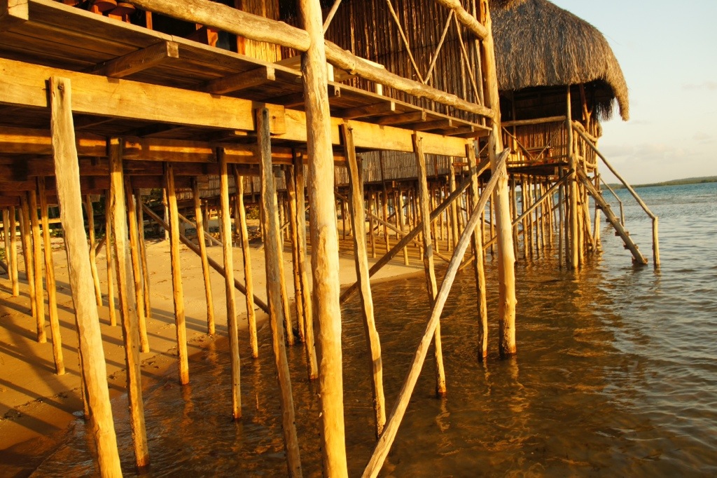 Die Bungalows (großzügige Palmenwedel-Hütten) liegen zur Lagunen-Seite etwas erhöht auf einem Holzpodest und das Meer rauscht ununterbrochen im Hintergrund. Der Wasserstand ist Gezeiten abhängig und bei unserer Ankunft konnten wir die vom Balkon führende Treppe bis auf den trockenen Sandboden der Lagune nutzen. Hunderte kleiner Krebse leben hier und rannten schnell und hektisch über den Strand. Das Abendessen war o.K. …