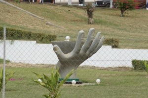 Eines der Fotos zeigte meinen Papa in Tete vor einem Denkmal … die offene Hand. Dieses Symbol fanden wir bereits mehrmals z.B. als Holzschnitzereien. Gern wollten wir ein Bild von uns vor diesem Denkmal aufnehmen. Das bedeutete zurück nach Tete und wieder auf die südliche Seite des Sambesi. Kurz nach dem wir vor Befahren der Brücke unseren Brückenzoll entrichtet hatten winkte uns eine für uns schwer bewaffnete Polizei-Streife heraus.