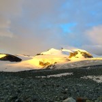 Nach einer Katzenwäsche mit eiskaltem Wasser und einem „sprachlosem“ und kurzem Frühstück legten wir unsere Gamaschen und den Klettergurt an. Noch im Dunklen – die Sonne begann ganz zaghaft, bereits zu erahnen, hinter den Gipfeln der umgebenden 4000 Meter hohen Bergen aufzugehen – starteten wir in den Tag. Im Licht der Stirnlampen stiegen wir den steilen Weg zum Gletscher hinab. Mit angelegten Steigeisen querte ich meinen ersten Gletscher – weit und breit waren wir die einzigen, die hier unterwegs waren. Eine geniale Stimmung, die Sonne hatte es inzwischen über die Berggipfel geschafft und sorgte auf der gegenüberliegenden Bergflanke für spektakuläre Lichtschauspiele. Die Gipfel der einrahmenden Berge glühten wunderbar in der aufgehenden Morgensonne.