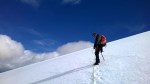 Allmählich wurde der vereiste, harte Gletscheruntergrund von immer mehr Schnee überdeckt. Vor uns war heute noch niemand auf unseren Berg gestiegen. Die voran gehende Seilgruppe spurte somit für uns den Weg. Dieser wurde immer steiler ansteigend und wir stapften durch den tiefer werdenden Schnee. Überall dem flogen die Wolken auf einem blauen, sonnigen Himmel über uns hinweg. Jegliche Geräusche von Zivilisation fehlten. Die Höhe wurde spürbar, die Muskeln begannen zu schmerzen. Der Wind pfiff heftiger und uns fehlte merklich der Sauerstoff zum verbrennen. Aber wir schnauften durch und gingen langsam und beständig in Richtung Gipfel weiter. Mein spürt seinen Körper, den Widerstand und stapft gegen den inneren „Schweinehund“ weiter an. Trotzdem überwiegt der Genuss – das vorwärts schreiten ist fast Meditation. Der Ausblick fantastisch – das endlose Weiss und der blaue Himmel darüber.