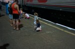 War in Moskau der Bahnsteig noch erhöht und ein Einstieg ebenerdig möglich, muss jetzt unsere Waggon-Chefin an jedem Halt eine grosse Stahlplatte im Türbereich anheben und eine Treppe auf den tiefen Bahnsteig ausklappen. Dann steht sie wie ein Wachposten vor der Tür und klappt kurz vor Abfahrt des Zuges wieder alles zurück.
