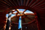 Das Leben in der Jurte der besuchten Familie ist ein sehr einfaches. Alles was im Kreisrund der Jurte direkt auf dem Grasboden der Steppe steht, ist der komplette Hausrat und Vorrat der Familie. Gleich links neben dem Eingang befand sich der kleine Waschtisch, die Zahnbürsten klemmten im Eingeweide der Jurte. Daneben stand ein Bett, auf dessen Überwurf wir zu viert Platz nahmen. Links neben uns stand ein zusammengerollter Teppich, vermutlich Schlafplatz für die kleine Tochter. Danach folgte ein kleines, sehr einfaches Spiegelschränkchen mit 7 buddhistischen Symbolen, unter anderem einem aus buntem Stoff, mit Goldfäden verzierten Säckchen, das Kostbarkeiten und Süßigkeiten der Familie enthält. Das Säckchen war nicht ganz zugeschnürt, damit das Glück hineinfließen kann und der Familie erhalten bleibt. Darunter befindet sich bei allen Nomaden der „Giftschrank“ für die Süssigkeiten für besondere Tage. Daneben stand das zweite Bett, neben dem sich einige Pappkartons mit Vorräten und wenigen Kleidern auftürmten und die Schale für die Quarkherstellung stand. Und schon war die Runde in der Jurte fertig! In der Mitte befand sich ein farbiges kleines Tischchen mit zwei bunten Schemeln und davor der Ofen, der gleichzeitig auch als Kochherd dient. An den Wänden hingen zwei kleine Jacken von Schingil und das war’s. Mehr nicht. Unsere Jurte, in der wir gerade leben, ist um einiges größer und komfortabler! Trotz allem- die drei machten in ihrer Einfachheit einen glücklichen und zufriedenen Eindruck. Allein, wie sie miteinander, aber auch mit ihren Tieren umgehen, erschien uns sehr ausgeglichen. Selbst beim Melken der Stuten sang der Papa den Fohlen zur Beruhigung ein Lied vor.