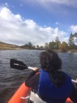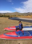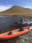 So nun das Kayaking zum Schluss! Die Chefin der grossen Jurte (mongolische Namen merken sich noch etwas schwer) fragte uns gestern Abend noch, ob wir mit einem Kajak Erfahrung hätten und schwimmen könnten. Die erste Frage können wir mittlerweile mit „JA!!!“ beantworten und warum Schwimmkenntnisse erforderlich sind, wissen wir nun auch 😊 … Nach dem Frühstück zogen wir mit einer voll beladenen Yak-Karre, einem noch etwas störrischem Yak und drei wild aussehenden mongolischen Gesellen flussaufwärts. Über eine Stunde wanderten wir ins sich verengende Tal, bis wir eine passende Stelle zum Inswasserlassen unserer Boote fanden. Für Conny und mich war ein aufblasbares Kajak vorgesehen und zwei unserer Begleiter kamen auf einem aufblasbaren russischen Katamaran zum Wildwasser-Rafting mit uns mit. Beim Aufpumpen der Boote lernten wir zumindest einen unser Führer besser kennen. Er sprach etwas russisch und stammte wie der Katamaran aus Sankt Petersburg oder Leningrad, wie er sagte. Warum ein offensichtlicher Mongole Leningrad als Geburtsstadt hat, war dann nicht mehr herauszubekommen … Der Fluss wartete auf uns!