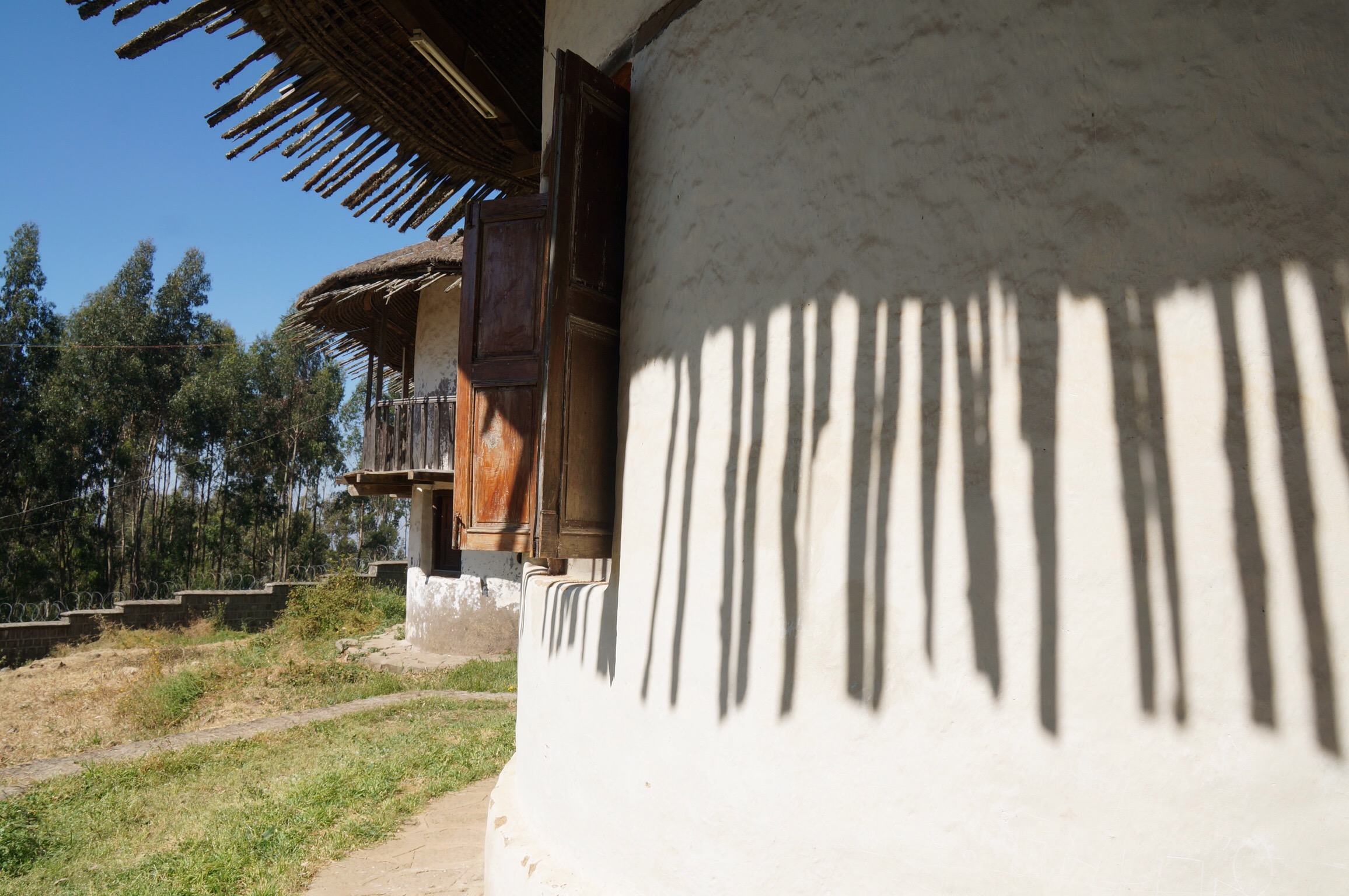 Den ersten Eindruck der Stadt bekommen wir sofort nach dem wir vom Parkplatz des Flughafens fahren. Alles hupt laut im chaotischen Morgenverkehr, es liegt eine Staubglocke über der 4-Millionen Metropole und stinkt im günstigsten Fall nach Abgasen. Aber wir sind, wie von uns gewünscht mittendrin in Afrika. Unser begleitende Fahrer, Alazar, lenkt den Minibus mit uns 4 Insassen gekonnt durch die von allen Seiten kommenden Fahrzeuge und Fussgänger. Die kurvige Bergstrasse hinauf zur Sankt Georg Kirche teilen wir uns mit beladenen Eseln und Frauen, die Eukaluptus-Holzbündel in Überbreite die Strasse hinab schleppen. Von knapp 3000m Höhe blicken wir auf die noch gar nicht so alte Stadt und wundern uns über den kaiserlichen Palast von Menelik. Der um 1900 errichtete Bau gleicht eher einem grosszügigen Bauernhaus bei uns. Keine gigantische Grösse oder übermässig prunkvoll … schlicht und dem beginnendem Verfall bereits preisgegeben.