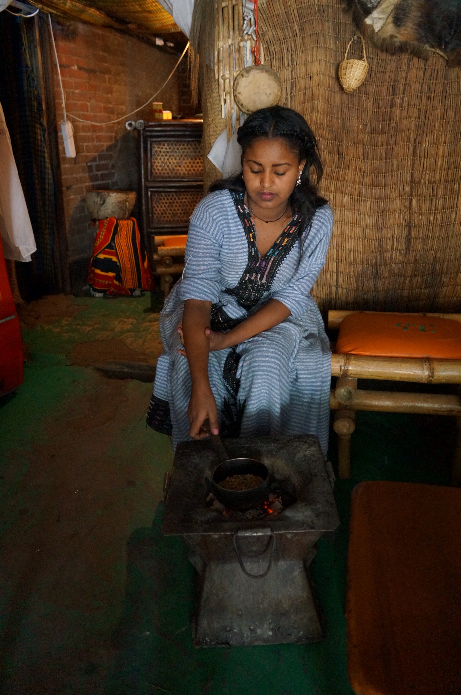 Lohnenswert ist der Besuch des sich unmittelbar neben dem Museum befindlichen Restaurants „Lucy“ auf jeden Fall. Wir wissen nun, wie wir mit fünf Fingern das weisse oder rote Injera inklusive sauciger Beilagen zum Mund führen. Etwas Übung brauchen wir aber noch, um damit Tisch und uns selbst sauber zu halten ☺️. Injera ist das äthiopische Brot. Ein grosser, grobporiger, weicher Fladen, der ein wenig an Sauerteig Brot erinnert, dient als Unterlage für verschiedene Saucen und wird von allen am Tisch Sitzenden abgerupft und verschwindet dann in den Mündern. Es war scharf, extrem sättigend, lecker und ein Spass zu essen. Den abschliessenden Kaffee bekamen wir dann frisch über einem Holzkohle Grill geröstet in einem kleinsten Laden in einer Seitenstrasse serviert. Der Duft von frisch gerösteten Bohnen wurde ergänzt mit vor sich hin glimmenden und räuchelnder Myrrhe und Weihrauch. Addis Abeba duftet also neu für uns!