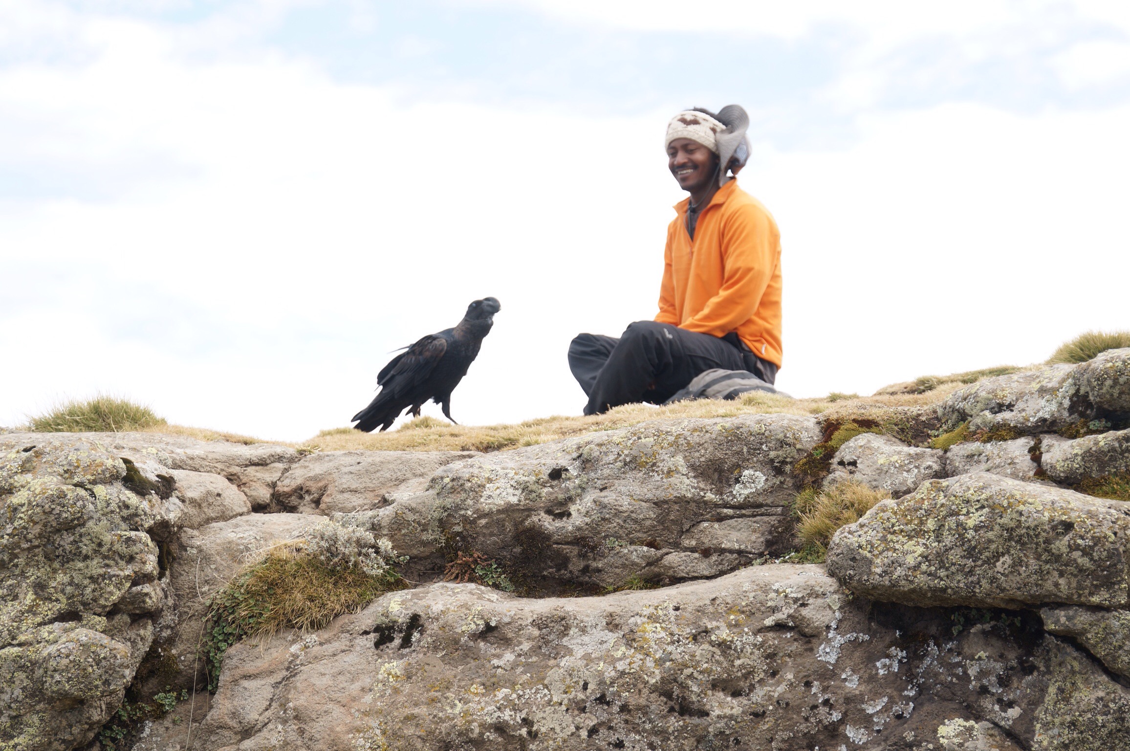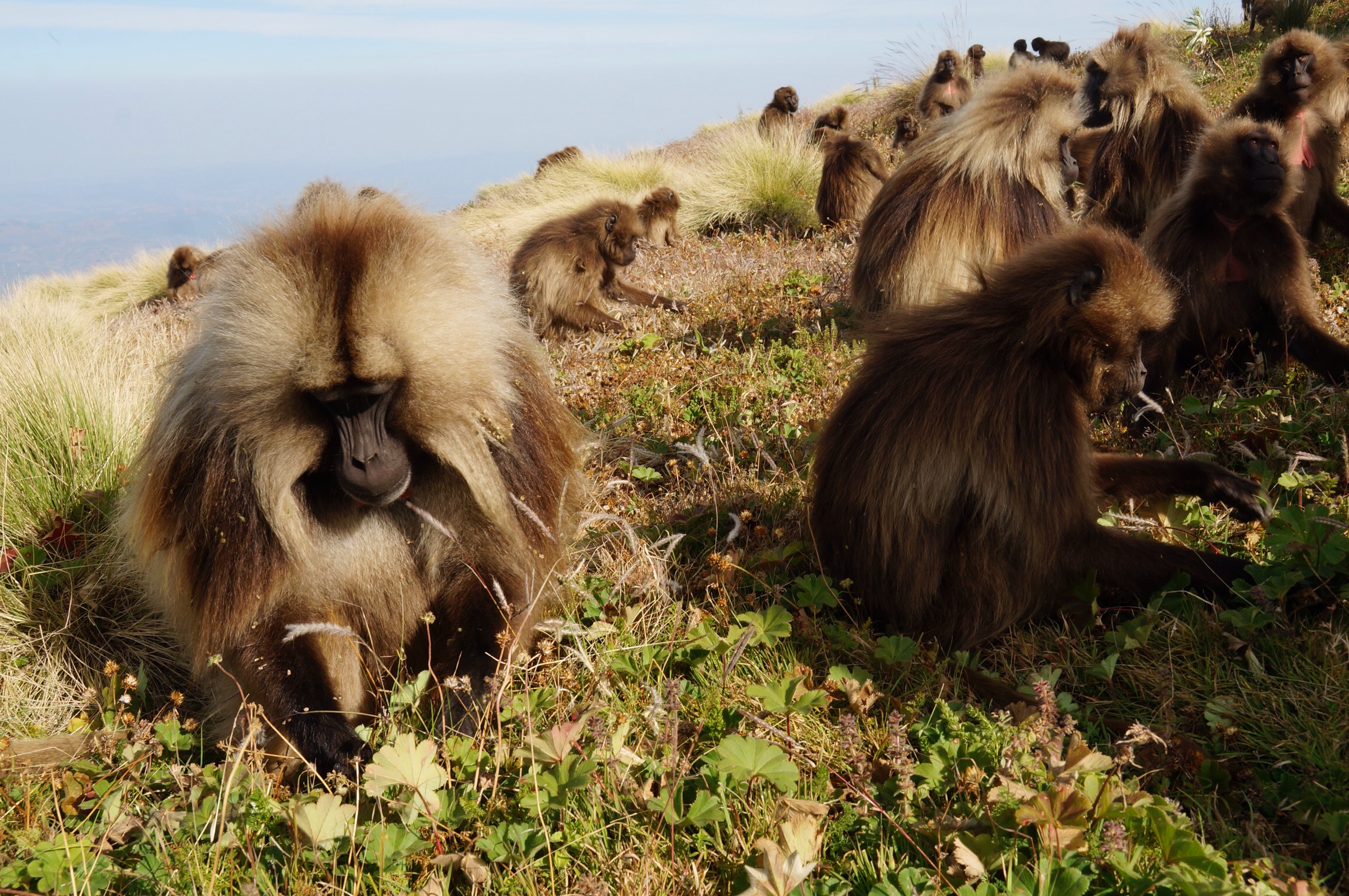 Gemächlich starten wir zu unserer ersten Tour hinauf zum Gich Camp. Wir wandern entlang der steilen Bruchkante und mitten durch einen frühstückenden Clan Blutbrust Paviane. Ein riessiges Rudel von bestimmt hundert Tieren in allen Grössen lassen sich nicht von uns stören. Es werden Gräser ausgerupft, kleine Äffchen gesäugt, am 1000m steilen Abhang sich gegenseitig gejagt und dominantes Gehabe gezeigt. Die Tiere sind zum Greifen nahe, aber wir halten uns respektvoll zurück … Obwohl die Tiere so flauschig sind! Der Anstieg zum Camp führt durch eine raue Hochlandschaft. Vom Rand unserer Steilwand blicken wir auf einen über 500 Meter tief hinab stürzenden Wasserfall auf der gegenüberliegenden Seite des Hanges. Der den Wasserfall speisende kleine Fluss bietet uns einen wunderbaren Platz für unsere Lunch-Pause. Wir picknicken mit nackten Füssen im klaren Wasser bevor die letzten immer beschwerlicher werdenden Meter bis auf 3600 Meter überwunden sind.