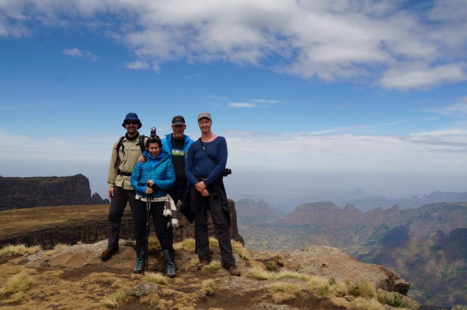 Die zweite Tour führt uns zum Akklimatisieren hinauf auf den Gipfel des Imet Gogo (3900 Meter) und bietet einen atemberaubenden Blick hinab auf bewirtschaftete Felder in steil eingeschnittenen Tälern. Der Anblick ist einmalig und mit nichts bisher von uns Gesehenem vergleichbar. Zum Abschluss unserer Tour durch die Simien Berge hat Conny heute ihren ersten Viertausender bezwungen und steht mit uns lächelnd an der schroffen Kante des Inatye (4070 Meter). Der Abstieg hinab ins Chennek Camp entlang der Kante erfordert noch etwas Aufmerksamtkeit, Schwindelfreiheit und einen sicheren Tritt. Wow … Was für wunderbare Tage mit freundlichen Menschen auf dem sehr kalten Dach Afrikas.