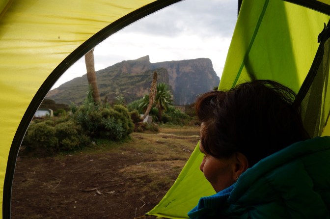 Unsere Zelte warten bereits auf uns und das einfache Dinner schmeckt vorzüglich im windigen, kalten Zelt. Mit uns am Tisch im Licht einer Kerze sitzt Banti und wir finden Gelegenheit mit ihm über sein Leben in Äthiopien zu reden. Er studierte Wirtschaft, arbeitete in einer Bank und ist nun Führer von Reisenden wie uns durch die Berge. Er gehört zu Volksgruppe der Amharar, stammt aus den Bergen und wohnt in der Stadt Debrack. Als wir auf die Tage Anfang Oktober zu sprechen kommem ist seine Trauer zu spüren. Auch in Debrak gab es Tote bei den Unruhen und Freunde von ihm sitzen im Gefängnis. Er meint, froh zu sein, mit uns in den Bergen zu sein und nicht unten in der unsicheren Stadt mit korrupter Polizei und Militär. Banti erzählt im perfekten Englisch eloquent über die politische Situation in Äthiopien und seiner Region. Er ist gut informiert über die Situation in Europa und der Welt und wir diskutieren über die morgen anstehende US-Präsidenten Wahl. Er interssiert sich für unser Alltagsleben, will ein vergleichbares, freies Leben hier in diesem Land führen.