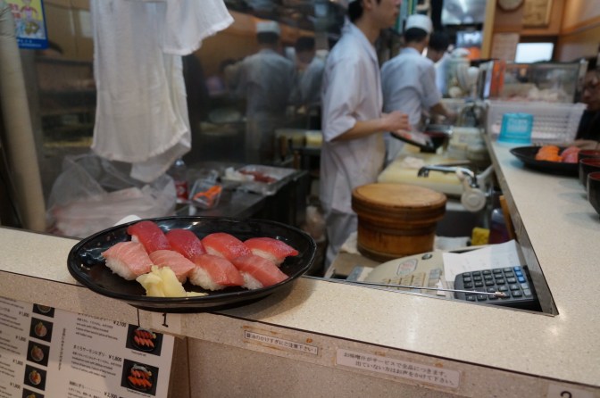 Ausserdem lohnenswert: ein Besuch des Fischmarktes. Zwar ist die Thunfisch Auktion in einen anderen Stadtteil umgezogen… aber immer noch werden riesige Mengen Fisch auf dem Markt an kleinen Ständen gehandelt. Die fangfrischen Fische werden mit grossen Messern und Sägen (sogar Bandsägen stehen auf einigen der Stände) zerlegt und gehandelt. Der Handelstag endet gegen 12 Uhr mit dem Reinigen der Werkzeuge und der Arbeitsflächen, verschmutztes Wasser spritzt herum, alles muss verpackt werden und wir Touristen stehen im Weg. Gut, dass man gleich nebenan frischesten Fisch zu Sushi verarbeitet. In schmalen Gängen warten die Gäste, um dann an langen Tresen rohen Fisch und Grüntee zu geniessen. Lesen konnten wir nichts … essbar war aber alles!
