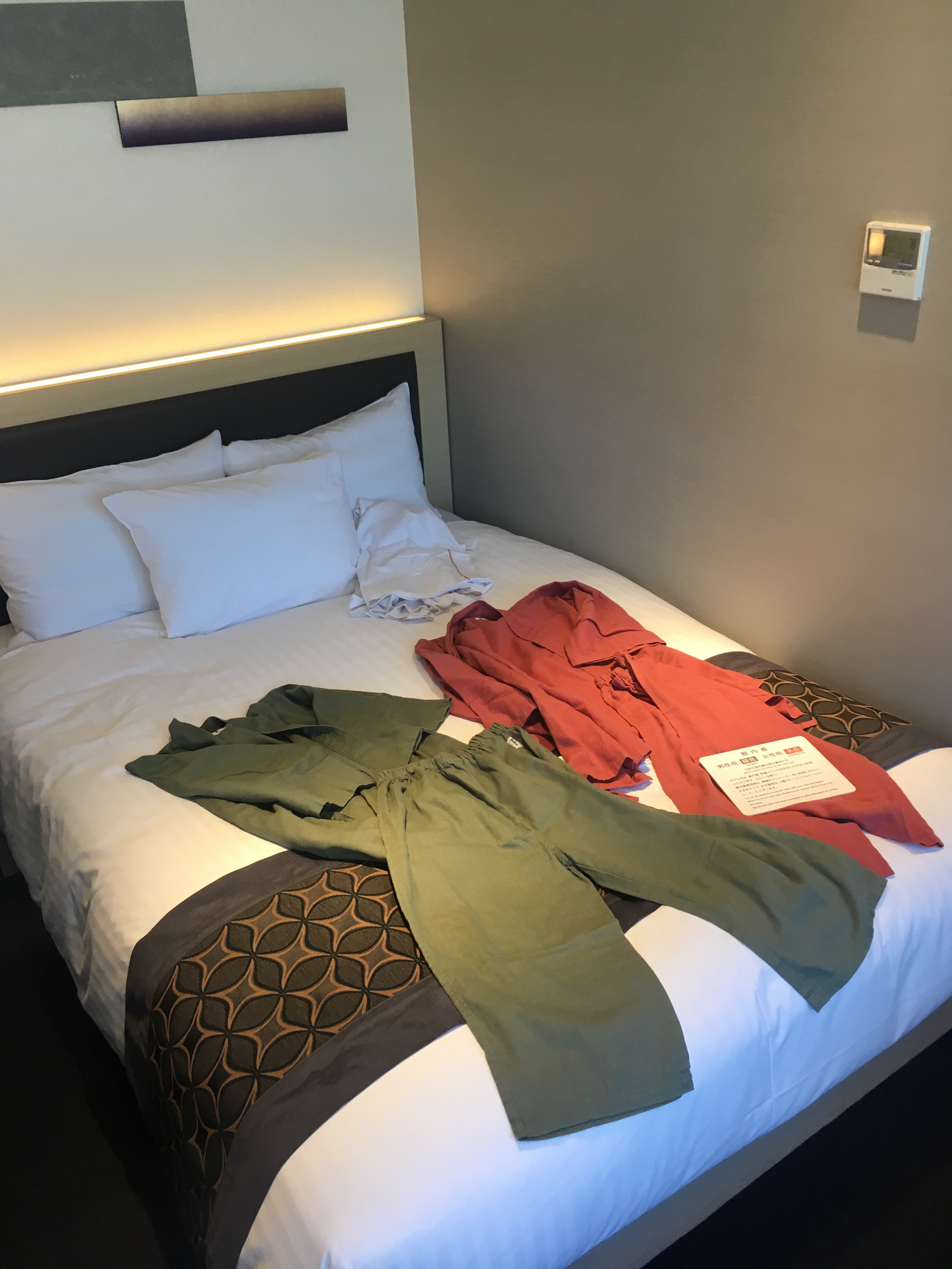 Nach einer kurzen Wanderung vom Bahnhof sind wir auch schon im Hotel angekommen. Was für eine Begrüßung! Zu dritt warteten die jungen Frauen in strengen Kostümen am Eingang. Eine erledigte mit uns die Anmeldeformalitäten, die zweite servierte uns feinen japanischen Grüntee und die dritte assistierte. Dann folgte die Einweisung in die Verhaltensregeln dieses Hotels: mit Bildern erklärten sie uns, wann und wo welche Schuhe getragen werden, wo der Yokatan, der auf unserem Zimmer auf uns wartete, getragen wird (und wo nicht) und welches der vielen Sachen der Pyjama ist, der auf keinen Fall außerhalb unseres Zimmers zu tragen ist. Oje, ganz schön kompliziert 😬 Aber wir schafften das!