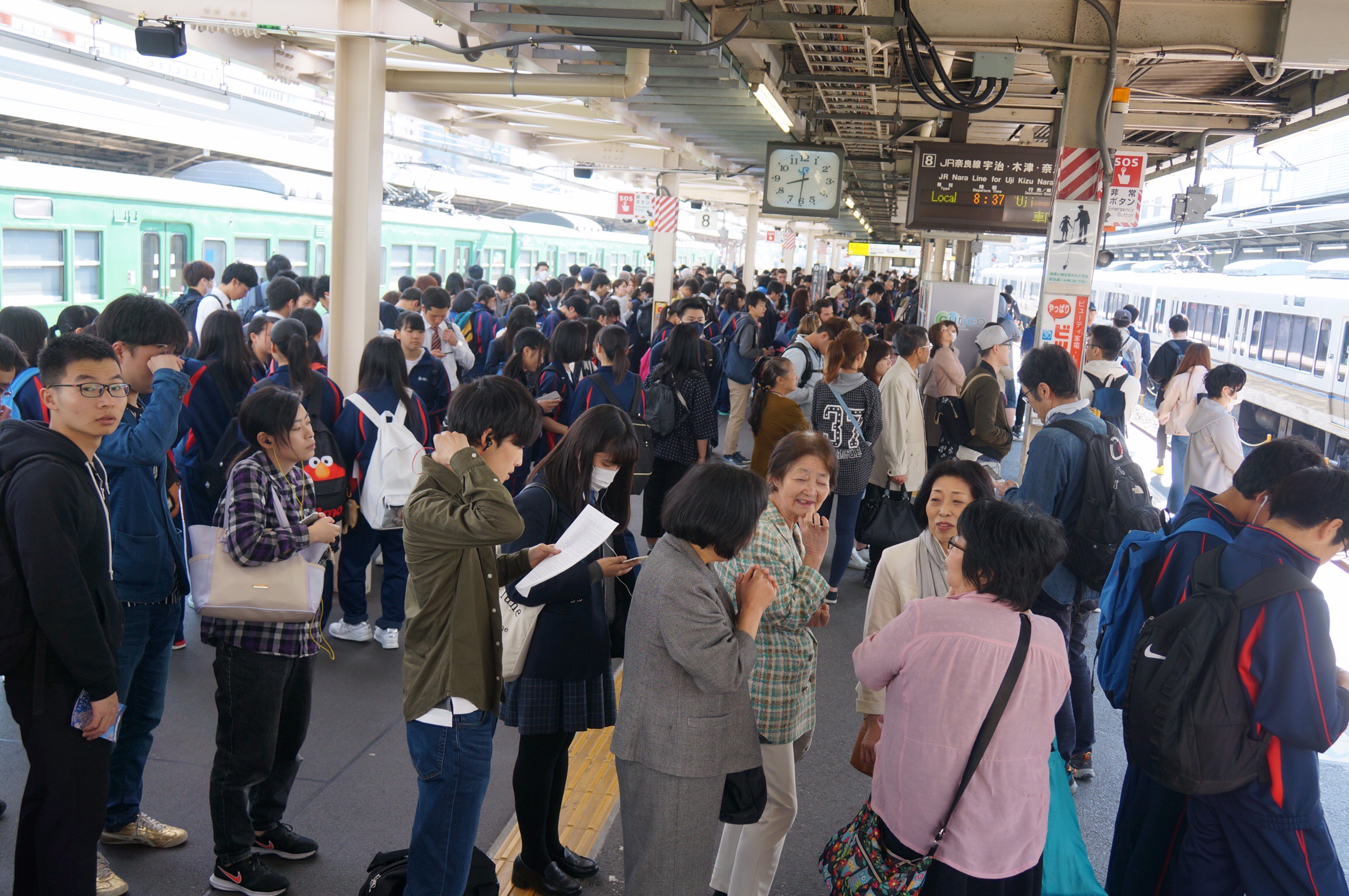 Wir haben uns gegen das Fahrrad entschieden … ein Fehler. An zwei Tagen kommen wir auf jeweils 30 000 Schritte. Ich, Jörg, bin halt ein Menschenschinder :). Es beginnt immer so harmlos. Mit der Vorortbahn zum ersten Ziel gemütlich tuckern war der Plan … die japanische Rushhour die Wirklichkeit. Bereits am Bahnsteig war vor vielen Menschen die Farbe des Steinbodens nicht mehr zu erkennen. Mitschwimmend spült es uns in die Bahn und immer noch Menschen uns hinterher. Umfallen war unmöglich.