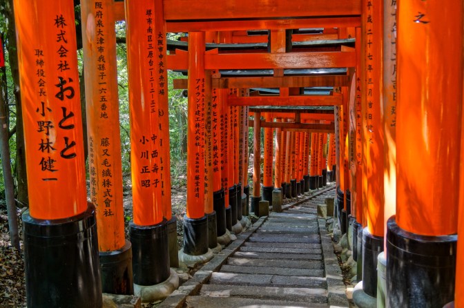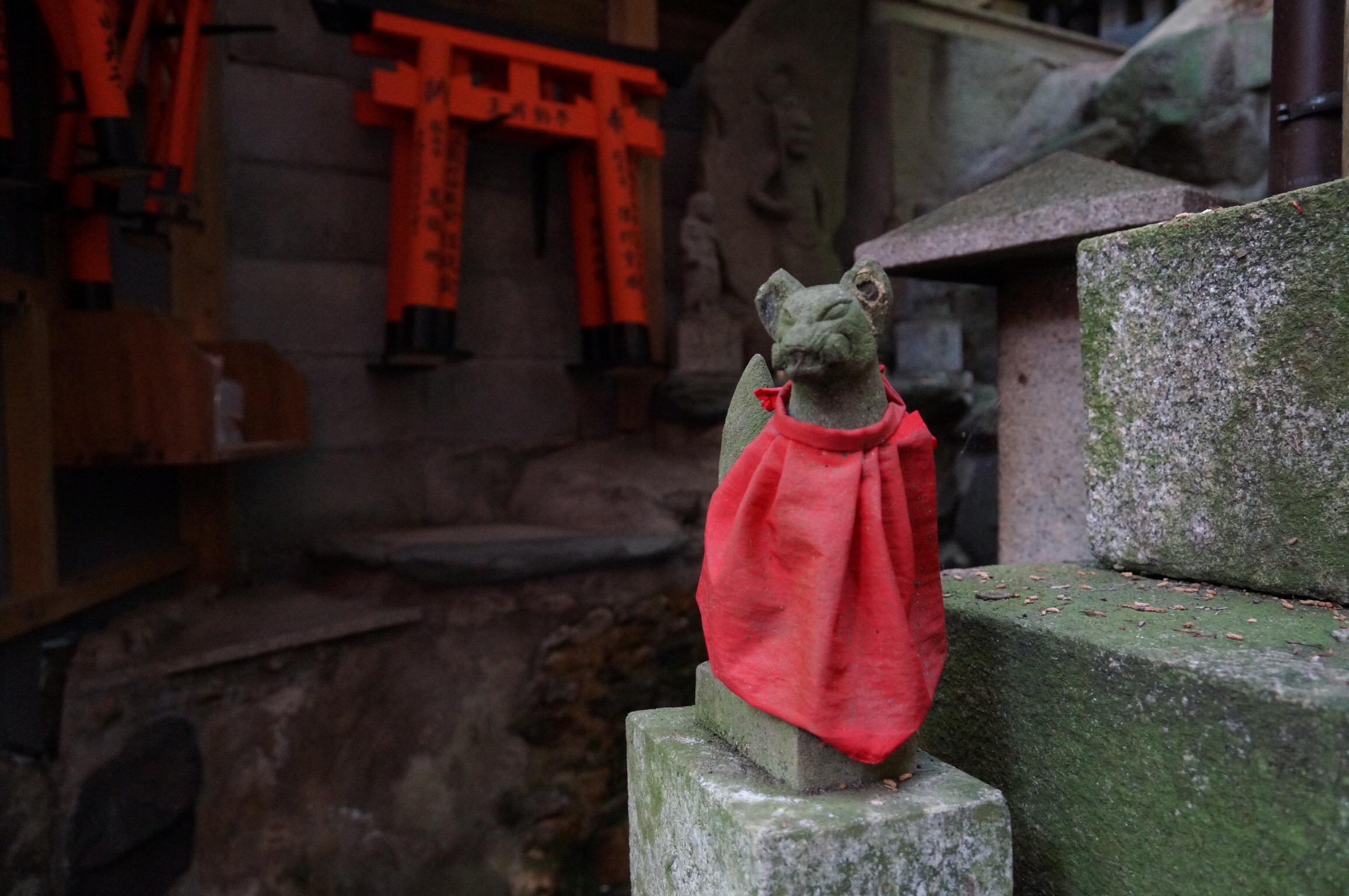 Bei der riesigen Auswahl an Schreinen und Tempeln muss man Schwerpunkte setzen. Liegt das Interesse eher bei Shinto-Schreinen, buddhistischen Tempeln oder will man einfach einen wunderbaren, inspirierenden Platz besuchen. Wir wollten rote Tore sehen, eines der Bilder, welches uns zur Reise nach Japan inspiriert hatte. Ein Besuch des Fushimi Inari Schreins lohnt sehr. Ein üppig bewaldeter Berghang, fast ein Urwald, liefert die Kulisse für 10 000 rote Torii Tore. Garantiert hat jeder ein Bild davon im Kopf: zwei mächtige Pfosten tragen 2 Querriegel, die an den Enden leicht nach oben gebogen sind. Mit uns streben viele Besucher den Berg aufwärts durch den Tunnel der roten, von der Sonne wunderbar beleuchteten Tore. An einem der Schreine zweigt ein kleiner Weg ab, der von all den anderen ignoriert wird. Eine super Gelegenheit für sich zu sein. Der Weg schlängelt sich, zwar ohne Tore, durch einen Wald von riesigen Bambusstämmen an kleinen Schreinen und Gräberfeldern vorbei. Überall sitzen Füchse (aus Stein :-)) mit roten Lätzchen um den Hals … noch eines der zu lösenden Japan Rätsel. Hat jemand eine Idee, wozu ein Fuchs (und auch sonstige Steinstatuen) ein Lätzchen tragen müssen?
