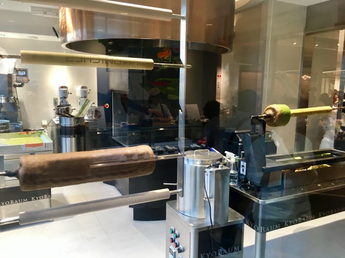 Ausserdem: Wir lieben Baumkuchen. Egal ob das Salzwedler Original, die Berliner Version oder der Baumkuchen aus der Lausitz. Und die Japaner teilen unsere Leidenschaft. Um den Bahnhof herum gibt es mindestens 3 Läden, die Baumkuchen (deutsch beschriftet) produzieren und in hochwertigen Verpackungen an den Käufer bringen. Geschmacklich passt es … nur die Form ist zu symmetrisch und nicht so wild wellig wie bei uns. Ausserdem findet sich in unserer Heimat noch keiner in grün ;o). Hier wir nämlich auch Machatee in den Teig gemischt – auch sehr lecker!