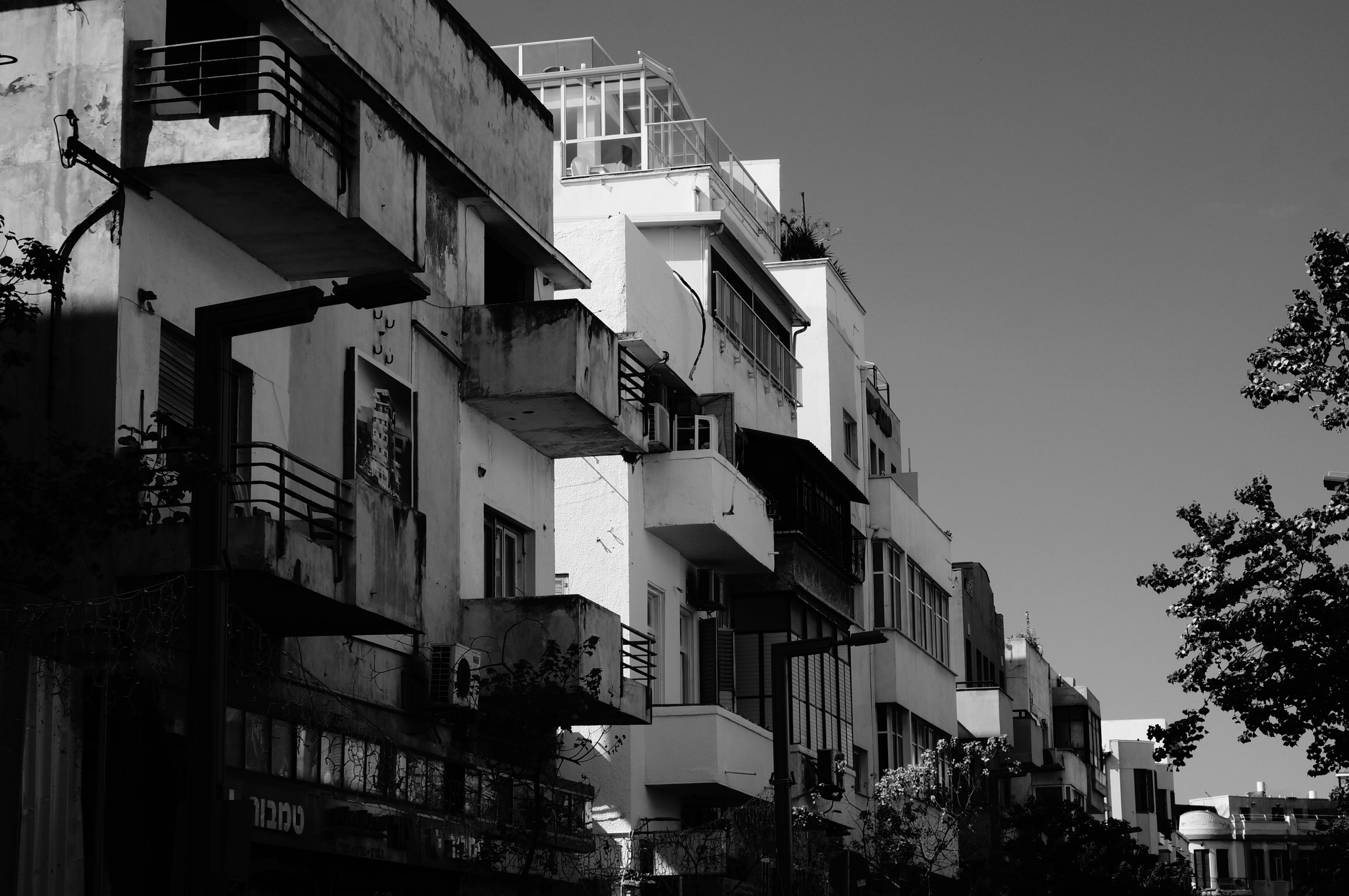 Wir dürfen mitten in der Stadt in einem kleineren Hotel schlafen und alle besuchenswerten Orte sind schnell zu erreichen. Cafés mit sehr gutem Kaffee und einem mehr als reichlichen Frühstück um die Ecke. Conny und Marie starteten mit Shashuka in den Tag … mir etwas zu viel Ei mit Tomatensauce. Das Viertel ist im internationalen Stil erbaut und bietet somit Bauhaus Architektur ringsum. Teilweise sind die Häuser saniert, bröckeln etwas vor sich hin oder es wurden Baulücken mit interessanten neuen Gebäuden bebaut.