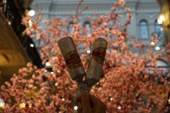 Aber es wäre ein Fehler nur Untertage zu bleiben. Wir hätten sonst den sintflutartigen Regenguss an der Kremlmauer verpasst und nicht die spassigen Minuten mit hunderten anderen geflüchteten Spaziergängern teilen dürfen … allerdings hatten wir unter der Zufahrtbrücke zum Kreml nur noch die Randposition ergattern können und wurden somit einseitig ordentlich nass. Die schnell wieder hervorschauende Maisonne trocknete uns auf dem Roten Platz und unser erstes Moskauer Eis, gekauft im GUM „tröstete“ und schmeckte wunderbar.