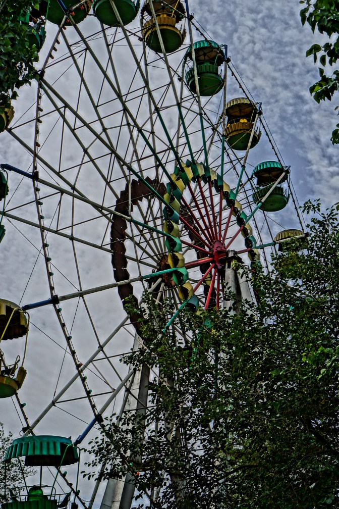 Der empfehlenswerte Dumont Usbekistan Reiseführer inspirierte uns zu einem Spaziergang aus der Altstadt hinaus. Wir sind todesmutig in ein altersschwaches, rostiges Riesenrad gestiegen (der vernünftige Teil der Reisegruppe, also ich, Jörg, natürlich nicht), an der verfallenden äusseren Stadtmauer zu einem grossen Friedhof gelaufen und haben einen wunderbaren Plov in der Keramik Fabrik essen dürfen. Ein feiner Zufallsfund … von der staubigen Strasse und der heftig glühenden Sonne etwas demoralisiert landeten wir in der wohl ehemaligen Betriebskantine der Chivarer Keramik Fabrik. Die fertigt die für diese Region typischen Teekannen und Tassen mit einem weiss-dunkelblauen Motiv. Das Weiss symbolisiert die Baumwolle auf den umliegenden Feldern und das dunkle Blau steht für den Himmel darüber. Natürlich sprach in diesem einfachen Lokal niemand englisch und unsere russisch Kenntnisse verwirrten erst einmal eher, als das diese hilfreich waren. Trotzdem bekamen wir heraus, dass wir gern auch so eine riessige Schüssel mit Plov bekommen können, wie sie auf einem der Tische vor 3 Männern verführerisch aussehend stand. Allerdings nur mit einer Wartezeit von 60 Minuten und einer ungefähren Angabe, wieviel Kilogramm wir 5 den gerne hätten … zur Orientierung diente uns die Menge, die die 3 usbekischen Herren mit Genuss vertilgten: 800 Gramm Reis … also sollte für uns fünf ausgewachsene Mitteleuropäer 500 Gramm ausreichend sein. Plus dem bereits beschriebenen Brot und verschiedene Salate wurde es dann doch recht anstrengend, alles zu vertilgen und vor allem danach den Spaziergang fortzusetzen.