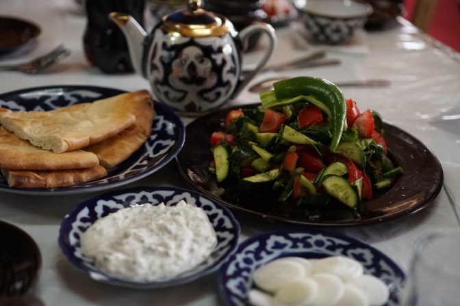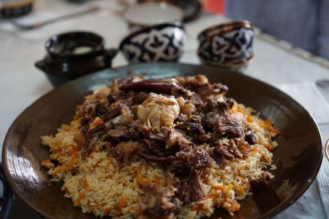 Da wir leider keinen fliegenden Teppich mehr bekommen konnten, sind wir jetzt bereits 1000 Kilometer mit verschiedenen Taxi und dem Zug durch Usbekistan gereist und haben mit Chiva unsere 4. Station erreicht. In Taschkent waren die nahen, hohen Berge im Klima der Stadt spürbar, angenehm warm am Tag, aber doch noch recht frisch in der Nacht. Nun hier mitten in der Wüste ist es heiss. Obwohl es heute Mittag dunkle Wolken am Himmel über Chiva hatte und es ordentlich donnerte, erreichte kaum ein Tropfen des fallenden Regens den Boden. Jetzt, kurze Zeit später hat wieder die heiss glühende Sonne fast die Alleinherrschaft am Himmel. Aber nicht nur das Klima lässt uns die Entfernung zur ersten Station erfahren, neben den Baustilen hat sich mit jeder Station auch das Essen verändert. Zum Plov komme ich gleich … Was unbedingt zu diesem wohlschmeckenden Reisgericht gehört ist Non (Brot).