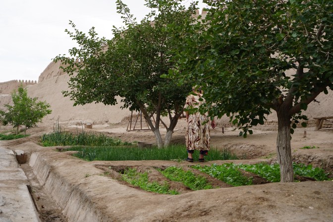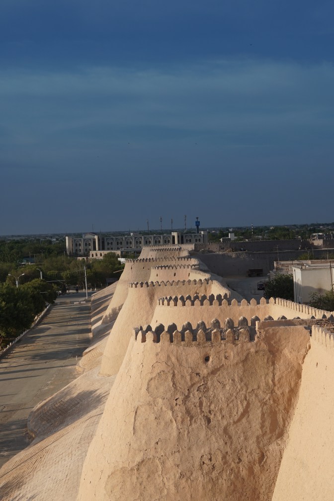 Und was bietet Chiva neben einem guten Brot … zum Beispiel 3 Nächte in einem einfachen, aber sehr guten Guesthouse innerhalb der alten Stadtmauern (http://www.meroskhiva.com) mit einer wunderbaren Terrasse (die, auf der ich gerade diese Zeilen schreiben darf 😀) mit einem beglückenden Blick von der Festung der Emire (Ark) zum nicht vollendeten bunt bekachelten Minarett und weiter in Richtung des östlichen Tores dem Horizont, der nur 20 Kilometer entfernten turkmenischen Grenze und viel Wüste entgegen. Die Gastgeberfamilie ist ausgesprochen freundlich und das Frühstück ein orientalischer Traum.