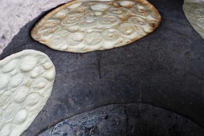 In jeder Stadt bekommst Du hier ein anderes Brot. Es gibt eine Vielzahl von Backstuben in den Gassen von Buchara, aber die Brote sehen nahezu gleich aus … in Buchara. Ganz anders dagegen sieht der Brotleib in Taschkent oder jetzt in Chiva aus. Die Brote wurden mit unserer Reise in den Westen des Landes immer flacher und breiter. Das Brot von Taschkent ist zwei Handflächen gross und rund nach oben gewölbt. In der Mitte des Brotleibes befindet sich eine Münzgrosse runde Vertiefung. Die Brote bleiben auch in Samarkand und Buchara rund, aber werden breiter und sind weniger hoch gewölbt. Die Vertiefung in der Mitte des Brotes ist breiter geworden und sorgt für einen knusprigen Genuss.