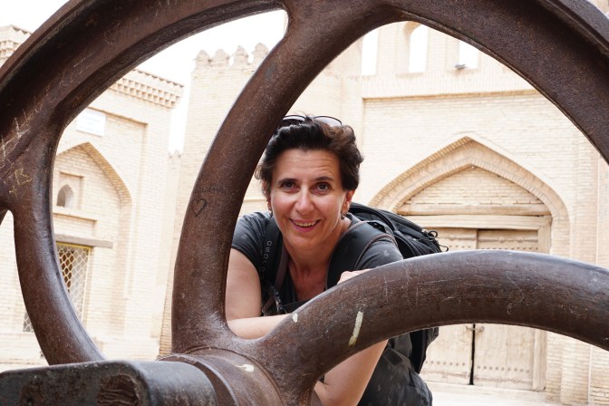 Bei unserer heutigen Runde entlang der alten, lehmigen Stadtmauer von Khiva durften wir zwei Frauen beim Brot backen vor ihrem kleinen, einstöckigen Haus zusehen. Die flachen, pizzagrossen Brotlaibe hatten ausreichend Zeit zum Aufgehen und stehen auf einem wackligen Holztisch in einer runden Schüssel zum weiteren Verarbeiten bereit. Bevor das Brot von der ersten Frau in den Ofen befördert, muss der vorbereitete Rohling nochmals mit dem Holz überwallt werden und dann, ganz wichtig, mit einem runden Stechwerkzeug aus vielen Nadeln in konzentrischen Kreisen „verziert“ werden. Die gestochenen Kreise geben dem Brot das typische Aussehen und verhindern, dass der Teig im heissen Steinofen zu sehr aufgeht. Die zweite Frau platziert geschickt den Brotlaib umgedreht auf einem konischen Kissen, besprüht die Oberfläche mit Wasser und klebt den Teig mit einem geübten Schwung an die Wand des Ofens. Der Ofen, zirka einen Meter hoch, hat eine runde Grundfläche, die sich nach oben hin zum Ofenloch verjüngt. Unten am Grund des Ofens wird gefeuert, früher nur mit Holz, jetzt sorgte ein Brennring mit Gas für ordentlich Temperatur im Ofen. Der Teig klebt seitlich an den Wänden, bläht sich leicht und kurz bevor er zu dunkel und kross wird wandert das duftende Brot wieder aus dem Ofen und dieser eine Laib warm in Connys Hände 🙂.