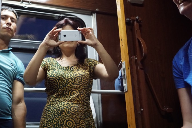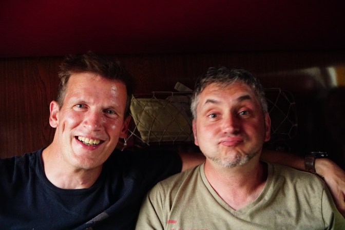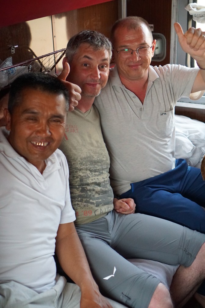 Von Thomas hörten wir 2 Stunden garnix und ich ging davon aus, dass auch er vor sich hin döst. Mitten in meiner Meditation stand Thomas in unserer Abteiltür mit leicht gekreuztem, aber seligen Blick auf der Suche nach Asyl. Die 3 Herren seines Abteils hatten kurz nach Urgensch die Anzüge aus und die Freizeitkleidung angelegt. Mischa, Kolja und Alek besiegelten gemeinsam mit Thomas und 3 Flaschen Wodka, gegrilltem „Vogel“ (wir vermuten Brathähnchen), hartgekochtem Ei, Gurke und Brot die deutsch usbekische Freundschaft. Thomas verdaute die zwei voll gefüllten Teegläser mit Wodka in unserem Abteil, wurde aber recht schnell von seinen neuen Freunden vermisst. Inzwischen kennen wir den gesamten Wagon, haben verschiedenste Sachen zum Essen und Trinken zum probieren bekommen und uns gut mit einer älteren Dame, einer Englisch Lehrerin, unterhalten können. Thomas lacht, singt russische Eisenbahnlieder und spricht mit Händen, Füssen und seinem wieder erinnertem Schulrussisch mit allen hier im Wagon … eine Metamorphose.