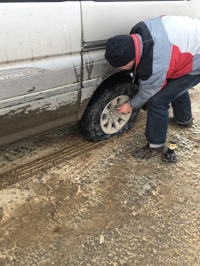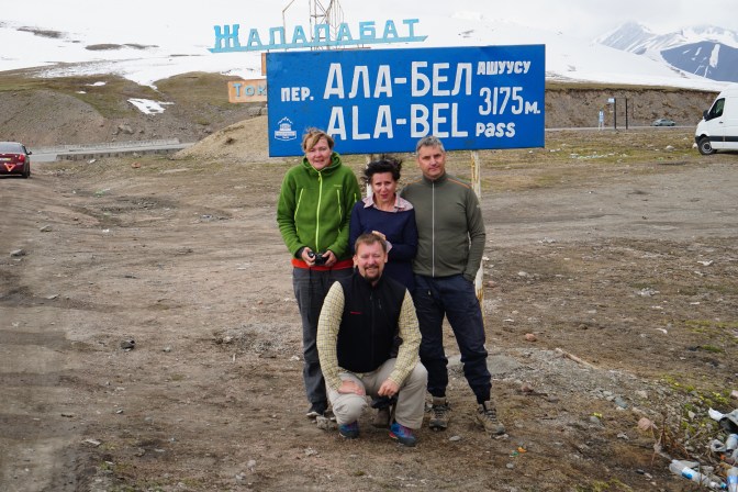 Um den Song Kul zu erreichen, muss eine bis zu 4000 Meter hohe Bergkette überwunden werden. Unser Fahrer, Anatoli ist auch ein Freund von rollender Planung und informierte sich fortlaufend über den Zustand der 4 Pisten, die zum See hinauf führen. Die naheliegendste Strecke war leider noch unpassierbar und zwang uns zu einem 100 Kilometer längeren Umweg. Kurz hinter Koshkor bogen wir von der Hauptstrecke auf eine 50 Kilometer lange raue Schotterpiste und schraubten uns langsam dem 3400 Meter hohen Pass entgegen. Das Wetter wurde immer schlechter, die Temperatur sank unter 0°C und der Schnee wurde stürmisch gegen den schwankenden Minibus gepeitscht. Langsam kämpfte sich unser Toyota die steile Serpentine mit schönen Tiefblicken durch Geröll, Schlamm, alten und frischen Schnee Höhenmeter um Höhenmeter nach oben. Kurz vor dem Pass stoppte Anatoli recht plötzlich. Einer der beiden Hinterreifen war geplatzt. Vermutlich fuhren wir schon eine Weile auf der nun qualmenden Felge. Mitten im Schneesturm wechselte Anatoli von uns umringt in weniger als 10 Minuten das Rad und unsere holprige Fahrt durch eine komplett weisse Wand und dem waagerecht stürmenden Schnee, zum Jurtencamp konnte weiter gehen.