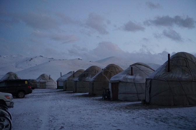 Gegen 20 Uhr erreichten wir das Camp und eine dampfende Schüssel mit Suppe und 2 (kleinere) Flaschen Wodka warteten auf unseren Held Anatoli und uns. Langsam liess der Schneesturm nach – nur noch Wind ohne Schnee – und Mond und Wolken zauberten ein wunderbares Abendlicht über das Jurtencamp. Dick eingerollt in unsere Decken hörten wir dem Wind, der über die Jurte fegte zu und schliefen alle ausgesprochen gut, hier oben auf 3000 Metern, bei diesem grandiosen tiefblauen Song Kul … am Ende ist alles gut, und ein See.