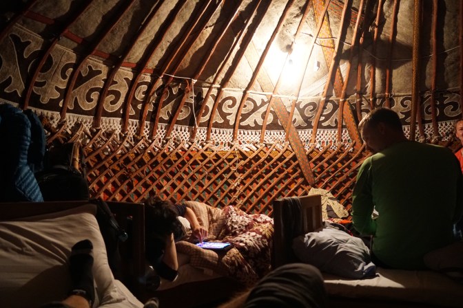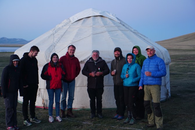 Nachtrag: Wir befinden uns in der Vorsaison, touristisch gesehen, für Kirgisistan. Die Hauptreisesaison beginnt mit dem Juni … aber bei schönem Wetter kann jeder 🙂. Daher ist es am Song Kul sehr ruhig und einsam. Wir sehen rundherum noch andere Jurtencamps, die aber noch nicht eröffnet haben. Unsere sieben Jurten sind die derzeit einzig bewohnten am Seeufer. Unsere Mittagspause verbrachten wir allein, sonnend auf der Wiese im kalten Wind. Gerade als wir unseren obligatorischen Moshe Feldenkrais Kopfstand übten, rollte ein VW Bus mit weiteren deutschen Gästen ins Camp … eine badische Winzerfamilie, deren Tochter gerade ein Auslandsjahr in Kirgisistan verbringt und von den Eltern und Freund besucht wird. So genossen wir den Sonnenuntergang am Song Kul mit einem Becher badischen Rotwein in der Hand …