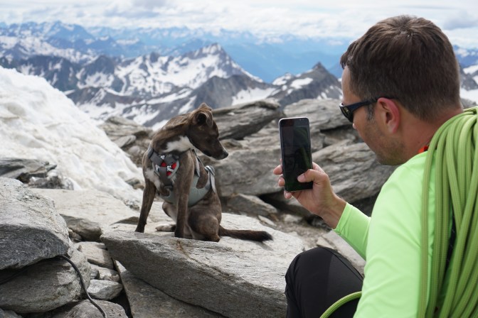 Aber das Highlight der Tour war unsere kleine Begleiterin … für Jule, Svens zypriotischer Hundedame war es die erste echte Hochtour und diese meisterte sie mit Bravour. Über den harschen, gefrorenen Schnee mit spitzen Eiskristallen half ein Huckepack Transport hinweg … ansonsten war der Vierpfoten Antrieb von Jule kraftvoll und sicher, um den Berg hinauf und wieder hinunter zu kommen.