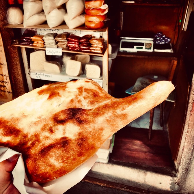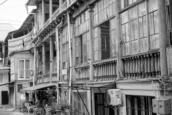 Ein anderer Duft hat uns dafür sofort gefangen genommen. Der Geruch von frischem, noch warmem, knusprigen Brot, dass gerade den Ofen verlassen hat und in einem Holzregal darauf wartet für recht wenig Geld gekauft zu werden. Gestärkt von trockenem Brot, sofort gegessen in einem der kleinen Stadtparks spazieren wir weiter durch die Strassen von Tbilisi. Die Architektur der Gebäude am Rand der breiten Strassen und schmaleren Gassen ist europäisch, erinnert oft an die Strassenzüge von Moskau … im Stil der letzten Zahrenjahre, bzw. dem Zuckerbäckerstil aus der Stalin Ära. Anders, für unser Auge ungewohnt sind die vielen Holzveranden, die die Häuser zieren. Viele der mit Schnitzereien versehenen Holzbalkone verfallen und kleben windschief an den alten Wänden. Katzen schleichen über die heissen Pflastersteine und Hunde dösen träge im Schatten alter Bäume.