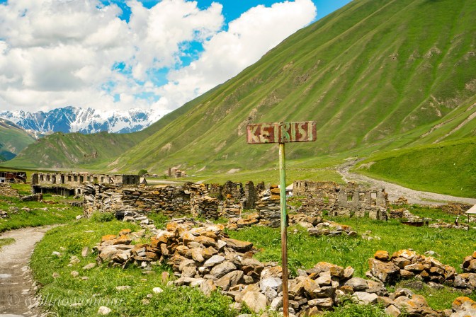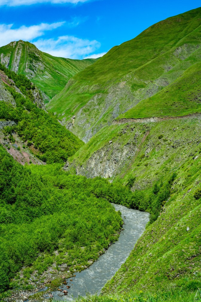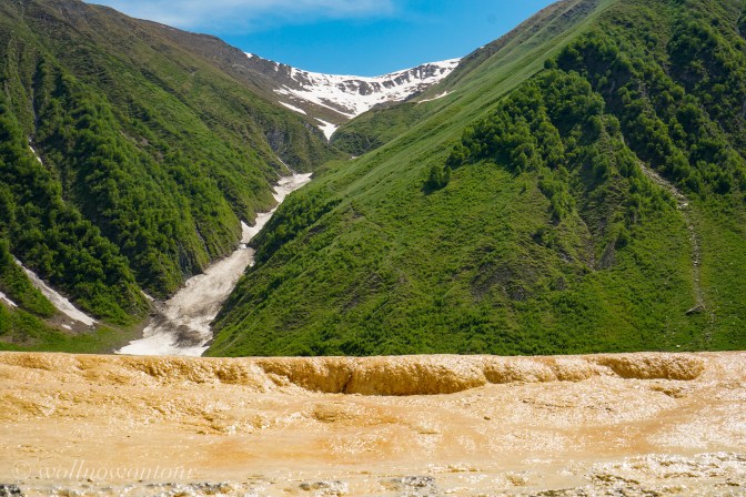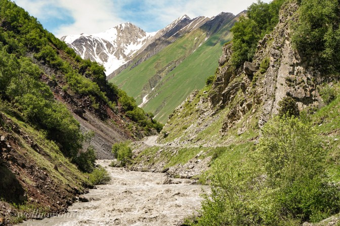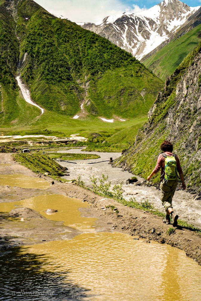 Die Wanderung spricht alle Sinne an. In der Nase der ganz leichte Geruch von fauligen Eiern, verursacht von schwefelhaltigen Quellen, deren Wasser über weissliche, dann schwefelgelbe Flächen über den Hang sickert und schliesslich in orange bis rötlichen Rinnsalen in dem wilden Gebirgsfluss Tegri münden. Allmählich weitet sich das Tal und es präsentiert sich ein Panorama voller Farben. Die Wiesen sind mit gelben, blauen und roten Blütensprengeln bedeckt. Das Grün der Weiden kriecht die Berge empor, wechselt zum felsigen Grau und wird an der Grenzlinie zum Himmel schneeweiss. Die über 4000 Meter hohe Bergwand umschliesst die weite Hochebene mit schneebedeckten Gipfeln und bildet eine Grenzmauer zum benachbarten Südossetien.