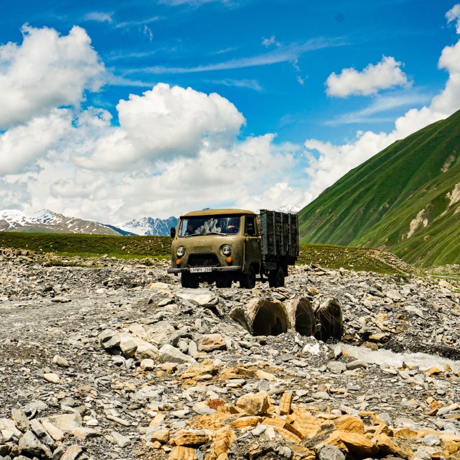 Wir wandern gemächlicher weiter. Nach dem etwas strengeren gestrigen Aufstieg zur Gergeti Kirche suchen wir heute die Ruhe und den Abstand zum recht von Mitreisenden bevölkerten Stefanzminda. Unser Geländewagen, ein alter aber robuster Mitsubishi Jeep schaukelt uns sicher über eine sehr raue Piste mit tiefen, Regenwasser gefüllten Löchern (eher Krater, in denen man fast hüfttief versinken könnte) bis zu einer kleinen Ansammlung von Häusern. Ein tosender Fluss, dunkel von vielen mitgespülten Sedimenten begleitet uns in ein sich immer mehr verengendes Tal. Schroff ragt eine Basaltwand zu einer Seite des Flusslaufes aus und wir steigen immer höher über den Fluss auf einem steil abfallenden Schotterweg hinauf. Verwunderlich empfinden wir die vereinzelten Fahrzeuge, denen wir Platz machen müssen … für uns wäre eine Weiterfahrt auf dieser Piste Zuviel Nervenkitzel gewesen.