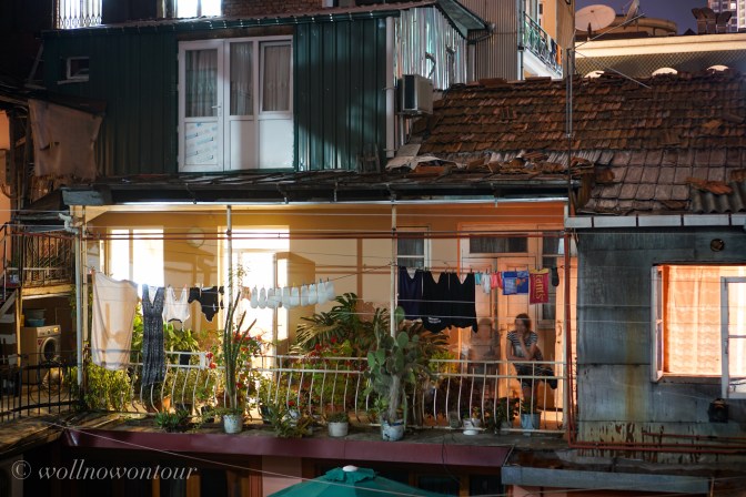 In einer der hell erleuchteten Wohnküchen wird das Nachtessen vor dem Fernseher eingenommen. Der Geruch der Speisen weht zu uns herüber. Auf dem mit Pflanzen vollgestellten Laubengang sitzen zwei Frauen im Dunkeln und unterhalten sich mit den männlichen Nachbarn im Innenhof. Das Gemurmel ist leise. Ab und zu hören wir ein lauteres Lachen.