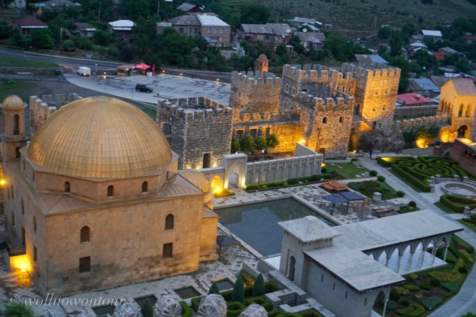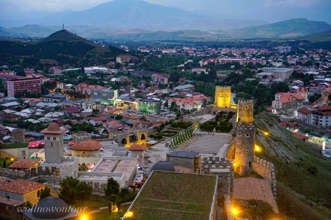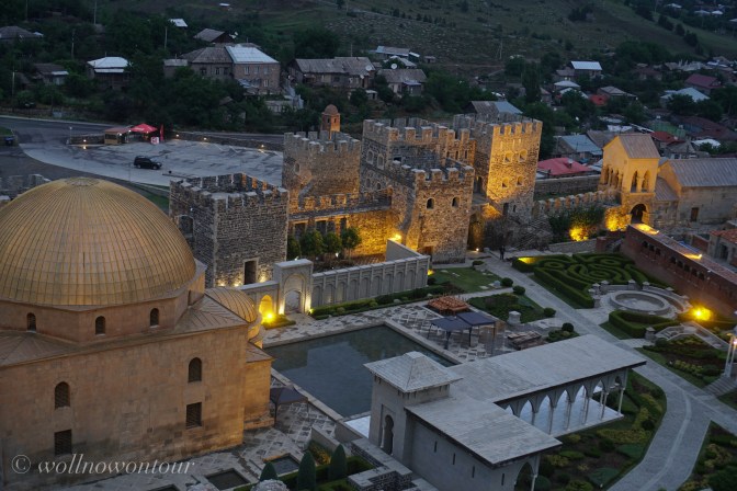 Natürlich hat unser Auto durchgehalten und erschöpft erreichen wir die nächste grössere Stadt. Achalziche ist eine alte Festungsstadt in der Nähe des alten osmanischen Reiches, der heutigen Türkei. Eine riesige, neu aufgebaute Festungsanlage thront über der Stadt. Mehr Disneyland als historisch korrekt rekonstruiert … aber wunderschön in den etwas kühleren Abendstunden im Halbdunkel zu besichtigen. Eine goldene Kuppel krönt die ehemalige Moschee wie beim Felsendom in Jerusalem. Die terrassierten Gartenanlagen mit Wasserbecken und Wasserläufen erinnern an die Gärten der Alhambra. Und ein mächtiger Bergfried überragt alles.