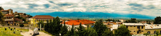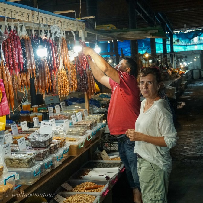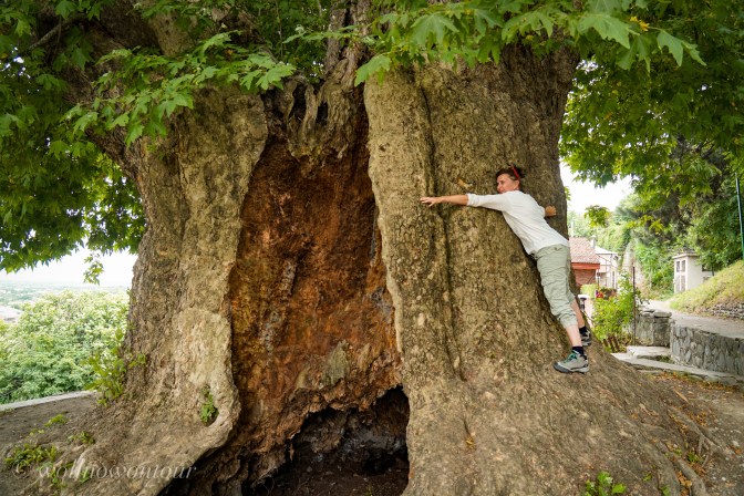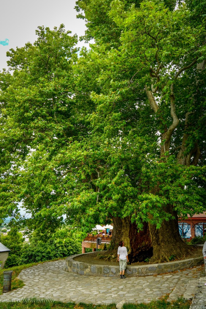Gerade noch haben wir uns in Telavi pudelwohl gefühlt. Die schöne Stadt liegt am Rande des nördlichen Teils des Kaukasus und von der leicht erhöhten Lage unseres Hotels haben wir einen grandiosen Blick hinab in die kachetische Weinebene. Unter uns liegt ein Garten Eden. Eine alte, tausendjährige Platane will von 11 Menschen umarmt werden. Die Gemüsegärten und die sanft geschwungenen Weinberge machen die Landschaft bunt. Eingerahmt von den Ausläufern des nahen Gebirges. Die Festung ist persisch, der Markt gross und farbenfroh, viele Holzbalkone der Häuser in der Altstadt sind saniert und in leuchtenden Farben gestrichen und das Essen georgisch lecker. Ein Ort zum eigentlich länger verweilen.