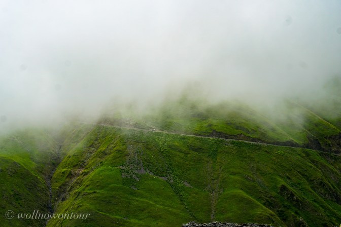 Plötzlich streben alle wieder ihren Fahrzeugen entgegen und langsam tastet sich Giorgi mit unserem Bus den Hang hinauf. Mit zunehmender Höhe verschwindet allmählich der uns bisher umgebende, dichte Wald und die nervenaufreibenden Tiefblicke nehmen zu. Auf den letzten 900 Höhenmetern kämpft sich unser Minibus mit seinen Insassen durch enge Kehren, einen stetig steiler und enger werdenden schlechten Wanderpfad dem Pass entgegen. Wolken verhüllen den Blick hinab in den Abgrund. Nach 4 Stunden sind wir knapp 80 Kilometer von Telavi entfernt und recht glücklich oben auf dem Pass.