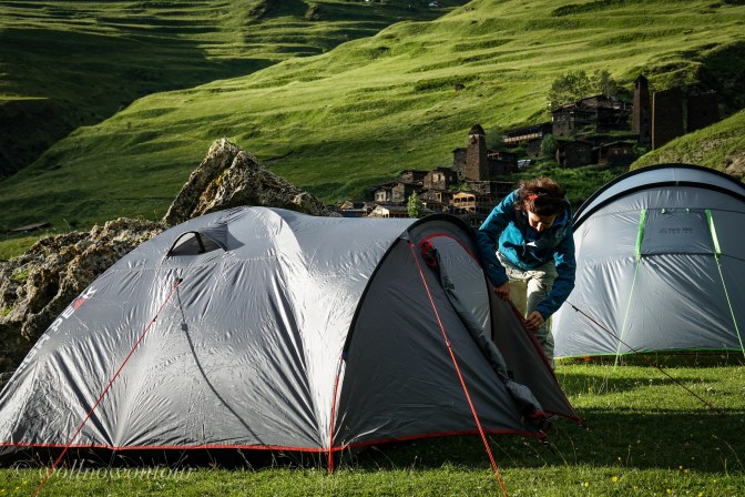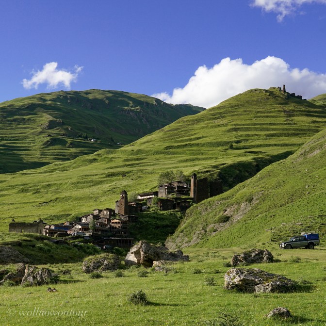 Am Tag zuvor sind wir im letzten, halbwegs dauerhaft bewohnten Dorf des tuschetischen Bergtals nach einer ersten Nacht im Zelt zu unserem Trekking über den Atsunta Pass gestartet. Dartlo heisst das Dorf und es schmiegt sich als schmaler Streifen an einen grünen Berghang. Hohe Wehrtürme dominieren die Dorfansicht und machen unmissverständlich klar, dass wir uns in einer schon immer unruhigen Grenzregion bewegen. Hinter dem Bergkamm, Luftlinie knappe 2 Kilometer in östliche Richtung liegt die russische Förderation mit der autonomen Repuplik Tschetschenien. Von diesem Land haben die meisten bestimmt schon irgendwann in den letzten Jahren in den Nachrichten gehört.