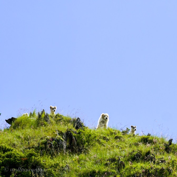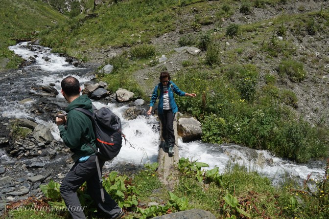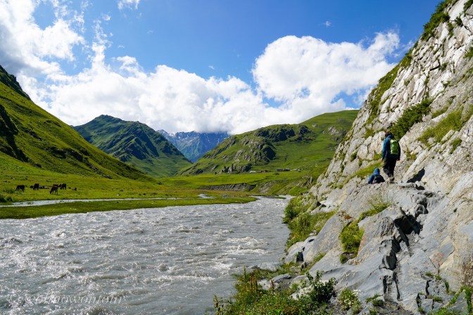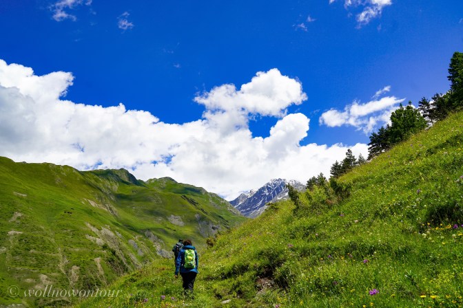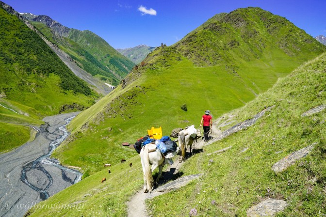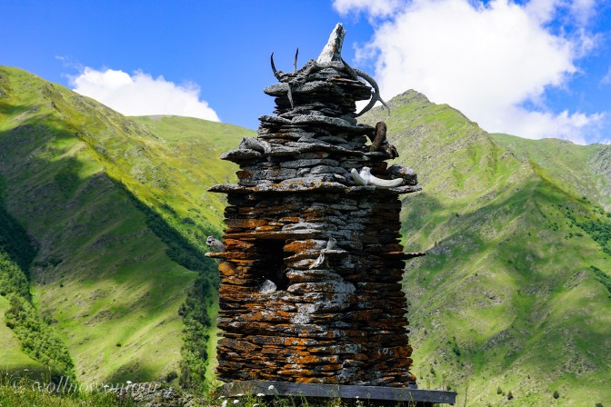 Gemeinsam mit Gigi, unserem georgischen Bergführer, Avto, dem Pferdeführer und zwei Lastpferden sind wir beständig ansteigend etwas oberhalb des Tales dem Flusslauf der Pirikita gefolgt. Der Wanderweg ist schmal, nur manchmal etwas ausgesetzt und führt durch bunt, von wilden Blumen gefleckte Wiesen. Vorbei geht es an archaischen Steinschreinen. Obwohl die Tucheten offiziell christlich-georgisch-orthodoxen Glaubens sind, schadet es nicht, auch noch die alten Naturgöttern zu huldigen und Opfertiere zu den Schreinen zu bringen … Allerdings ist es Conny verboten, sich dem Schrein zu nähren. Skeptisch beobachten uns Hirtenhunde von einem höher gelegenen Plätzchen, ob wir die regionalen Gepflogenheiten auch einhalten. Immer wieder durchschneidet ein wild sprudelnder Bergbach die Talwand und wir müssen in weiten Bögen eine möglichst seichte Stelle finden, an denen wir das eiskalte Wasser durchwaten können.