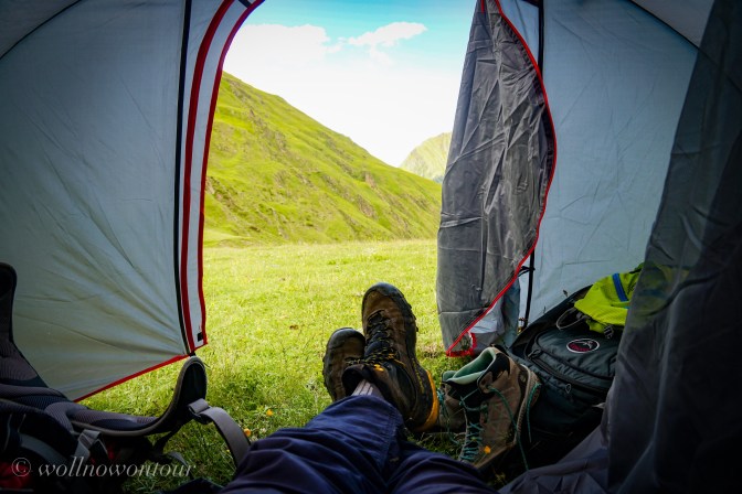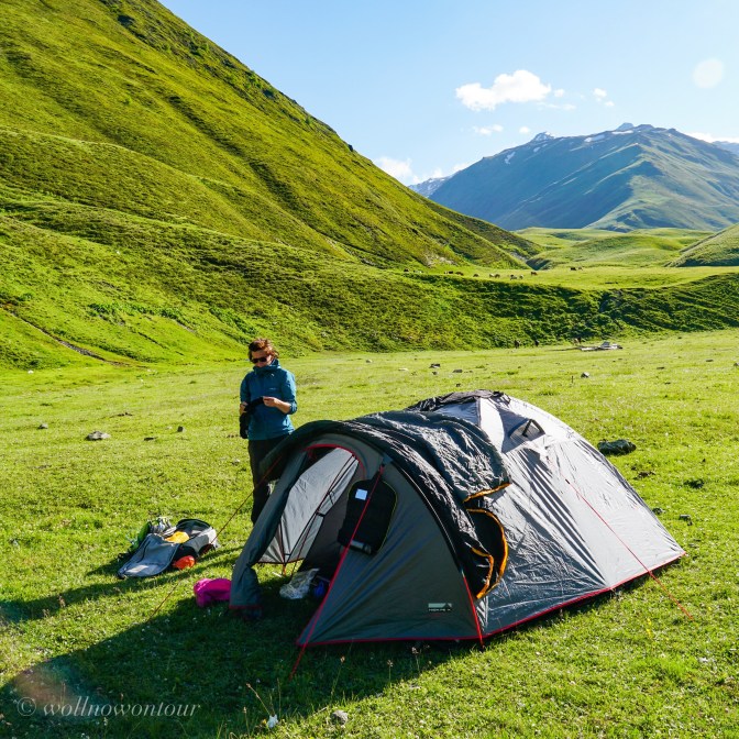 Ich, Jörg, durfte meinen Geburtstag schon an abgelegenen Stellen dieser Welt erleben. Zum Beispiel in Prora ☹️ in grauer, kratziger Uniform oder auf der Britania Hütte mit Blick auf das wunderschöne Strahlhorn 🙂 … aber so jenseits von aller Zivilisation wie dieses mal waren wir noch nicht so oft. In der Nacht vom 1. auf den 2. Juli stürmt es auf unserer Wiese vor dem fast verlassenen Dorf Girevi unaufhörlich. Das Überzelt klatscht fortlaufend gegen das Innenzelt und lässt uns nicht schlafen. Es ist richtig kalt und wir haben alles angezogen, bevor wir in unsere Schlafsäcke gekrochen sind. Als gegen 5 Uhr langsam die Sonne hinter den Bergen aufsteigt ist das Ende der Nacht förmlich eine Erlösung und die Aussicht darauf, weiter den Berg hinauf zu laufen ist angenehmer, als hier liegen bleiben zu müssen. Nur s chnell frühstücken und auf geht es wieder …