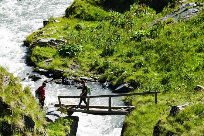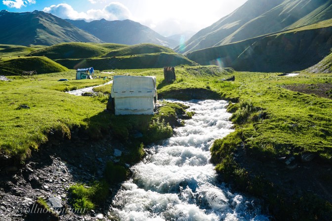 Unser Pfad wird schmaler und schwerer zu finden, steigt aber weiterhin nur moderat an. Nach 20 Kilometern erreichen wir auf einer Höhe von 2500 Meter eine wacklige Brücke, die den Fluss quert und zu einer grösseren Wiese etwas oberhalb des Flusslaufs führt. Ein idealer Platz für unser Nachtlager, weil: 1. Windstill und von der Abendsonne wunderbar gewärmt. 2. Ein Hirte einen temporären Verschlag aufgebaut hat und den patrulierenden Grenzern und uns Bier und Softdrinks verkauft und 3. wir für 5 Lari (etwas mehr als ein Euro) „duschen“ können.