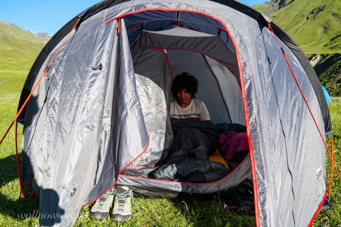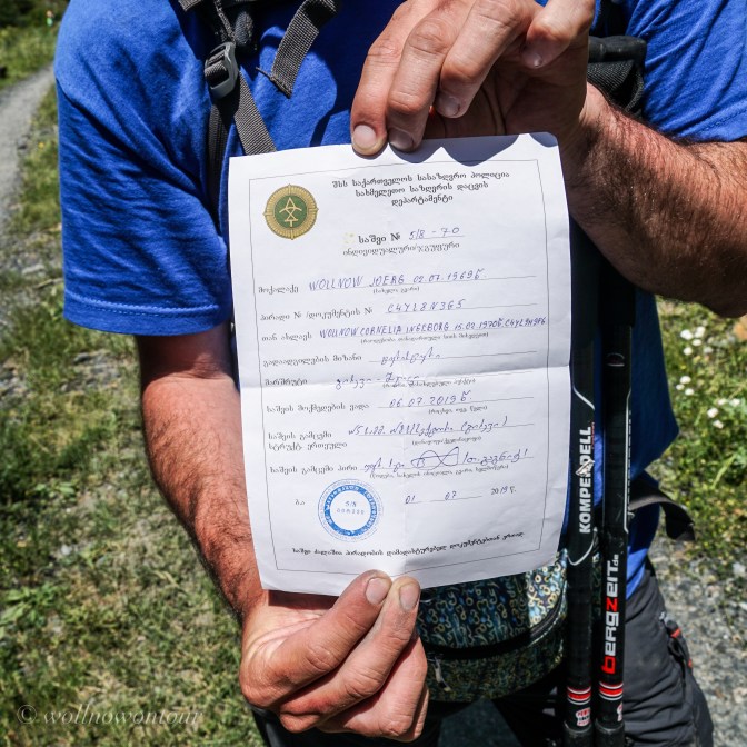 Nach unserer umstütmten Nacht sitzen wir noch leicht zitternd mit einer heissen Tasse Tee in unserem „Verpflegungs- und Kochpavillon“ der sich unter der Last des aufbrausenden Windes kaum senkrecht halten kann. Conny hat die ganze Zeit in der Tiefe ihres Rucksacks versteckt, meinen Lieblingskuchen mit sich getragen. So futtern wir genüsslich in der tuschetischen Abgeschiedenheit einen „kalten Hund“ 😀. Anschliessend müssen wir uns für den weiteren Weg, den wir vor uns haben, in der Grenzstation (eine kleine Baracke mit georgischer Flagge, besetzt mit zwei Grenzposten mit altersschwachen Kalaschnikows, garantiert kein Foto davon) abmelden. Wir bekommen ein offizielles Dokument, welches wir in drei Tagen in Mutso auf der anderen Seite des Passes wieder an der nächsten Grenzstation abgeben müssen. Somit sind wir ab sofort im Niemandsland der georgisch-tschetschenischen Grenzregion unterwegs.