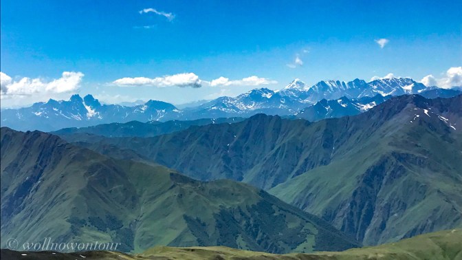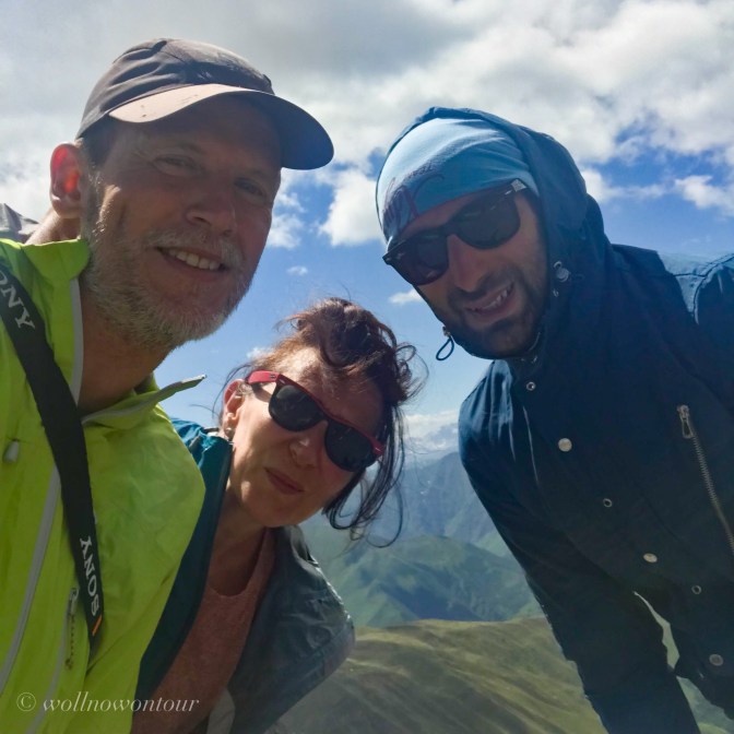Nach einer erholsamen Nacht, bei der uns nicht einmal die erst nach Mitternacht eintreffende russischen Alpinistengruppe stören konnte, streben wir nun mit langsamen Schritten dem knapp 3600 Meter hohen Atsunta Pass entgegen. Wie bei einer Hochtour in den Walliser Alpen klettern wir eine steile Wand in schmalen Kehren hinauf. Statt durch eine Schneewand stapfen wir hier allerdings durch loses Geröll. Vor uns steigen unsere Lastpferde mit ihrem Führer viel schneller dem Pass entgegen … gute Höhenanpassung 😉. Aber auch wir sind nicht zu langsam unterwegs und erreichen nach 4 Stunden den Grat und blicken zurück nach Tuschetien, dem steilen Grat des Tebulos (4500 Meter hoch, der Gipfel gerade so nicht mehr in Georgien, sonst wären wir hoch gestiegen 😉) hinauf und hinab in das sich öffnende khevsuretische Tal. Die Sicht ist sehr gut und wir dürfen einen Blick auf das Chaukhi Massiv (die Dolomiten Georgiens) und den fernen Kasbek werfen. Der Wind bläst mittelstark und lässt uns Zeit für eine kurze Rast, bevor wir weiter in nördliche Richtung dem Dorf Shatili entgegenwandern werden …