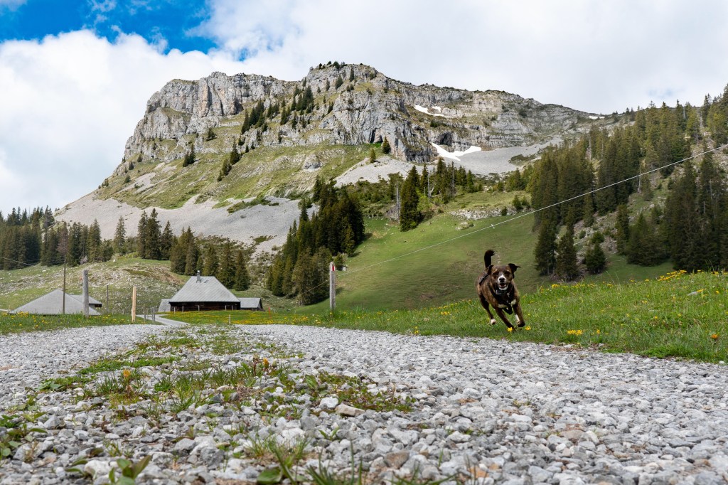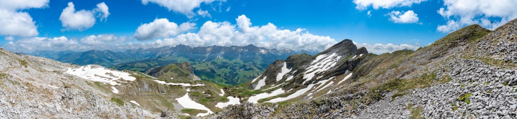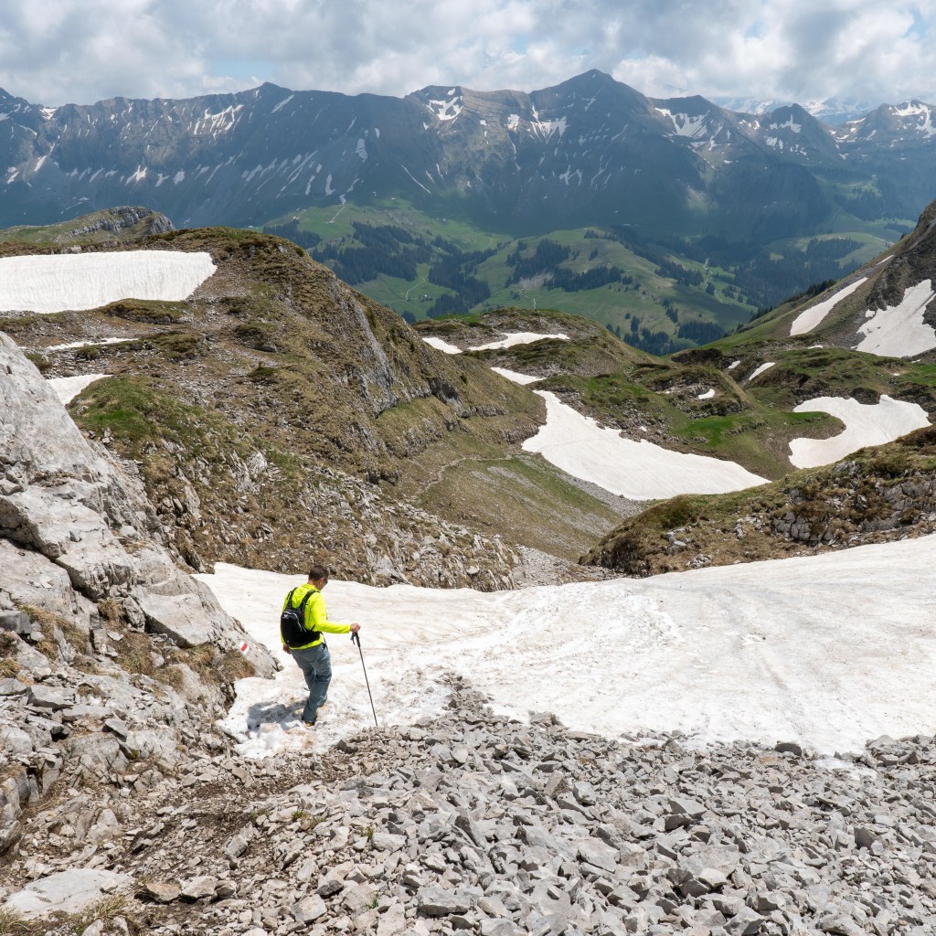 Zum Abstieg folgen wir dem Grat der Schrattenfluh. Eigentlich bietet sich eine schöne Gratwanderung der gesamten Kette entlang geradezu an, aber wir belassen es heute bei einem kürzeren Stück und steigen durch letzte Schneefelder wieder hinab zu unserem Wohnmobil.