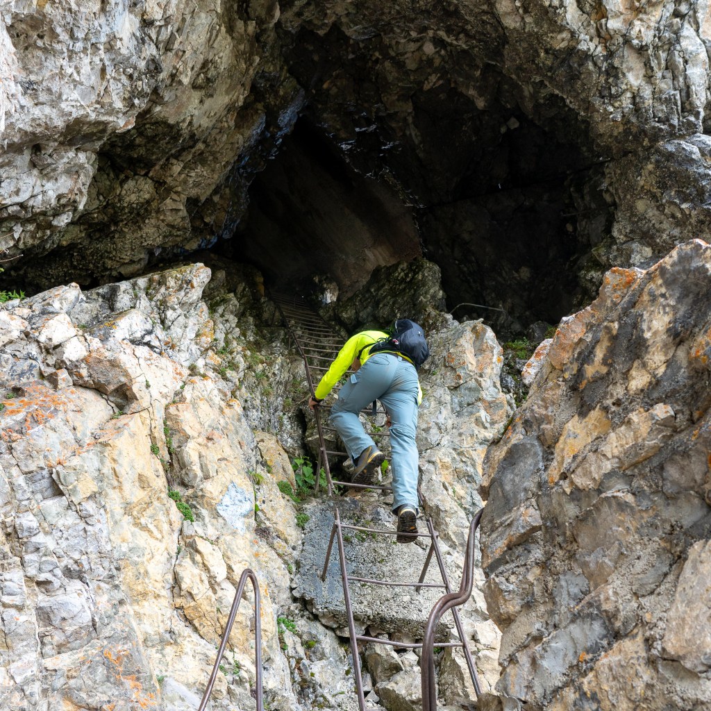 Eines der Höhepunkte dieses Weges finden sich auf den letzten Höhenmetern. Der Weg verschwindet in einer Höhle. Diese Höhle ist das Überbleibsel einer alten militärischen Anlage aus dem zweiten Weltkrieg. Über eine 20 Meter lange Stahlleiter geht es einen dunklen Kamin hinauf und dem Gipfel entgegen. Die letzten Meter halten noch eine besondere Felsformation bereit. Der Blick ins Tal in Richtung Kemmeriboden wird flankiert von einem Felsen-Hasen.