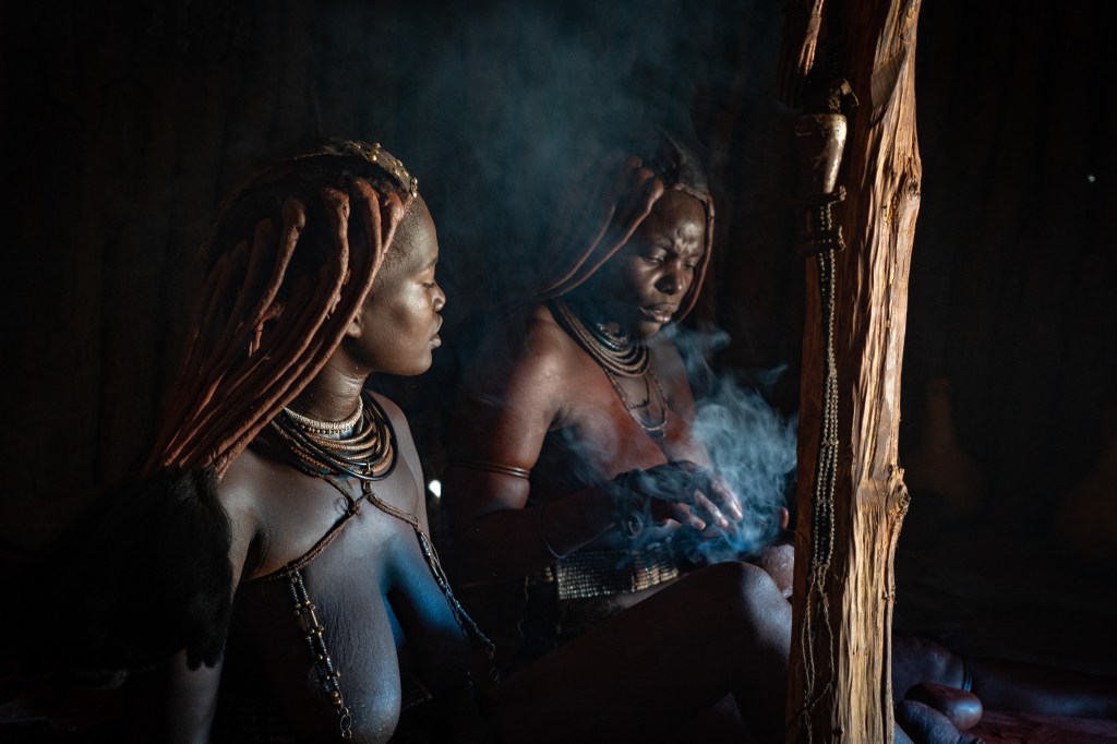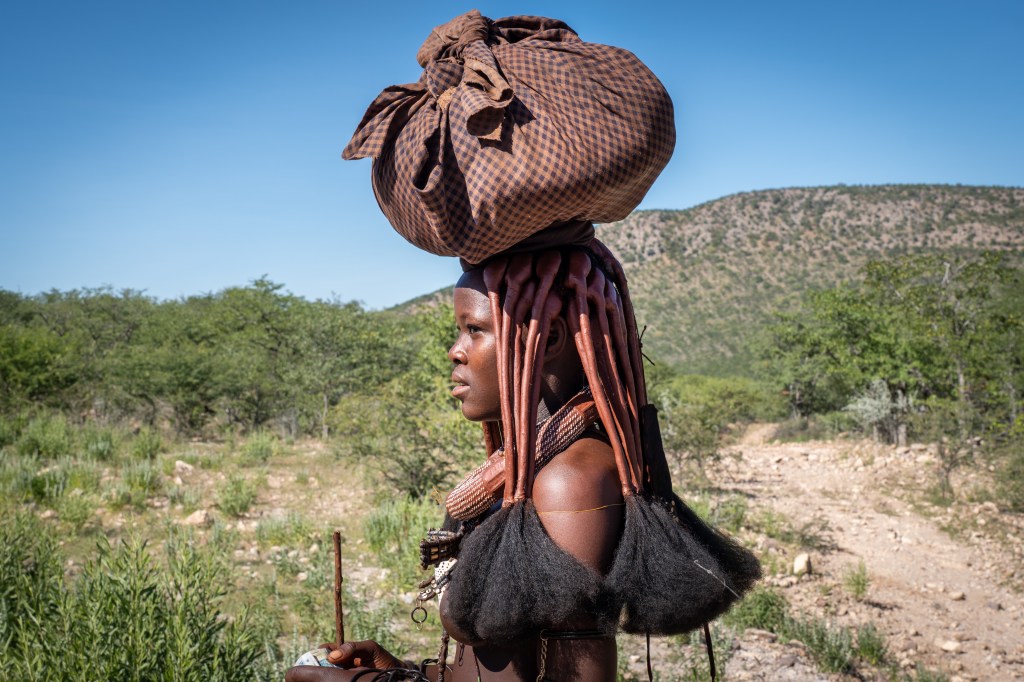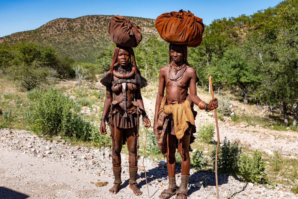 Auf dem Weg nach Opuwo fahren wir durch das Siedlungsgebiet der Himba. Links und rechts neben der Kiespiste liegen ihre von einem runden Holzwall eingefassten Dörfer. Wir stoppen kurz um 2 Himba Damen mit aussergewöhnlicher Haarpracht zu fotografieren und fragen uns wieder einmal, wie wir es finden würden, wenn wildfremde Menschen uns am Strassenrand für ein Foto ansprechen würden oder an unserer Haustür klopfen und fragen, ob sie unsere Wohnstätte einmal besichtigen dürfen … wäre befremdlich, oder?
