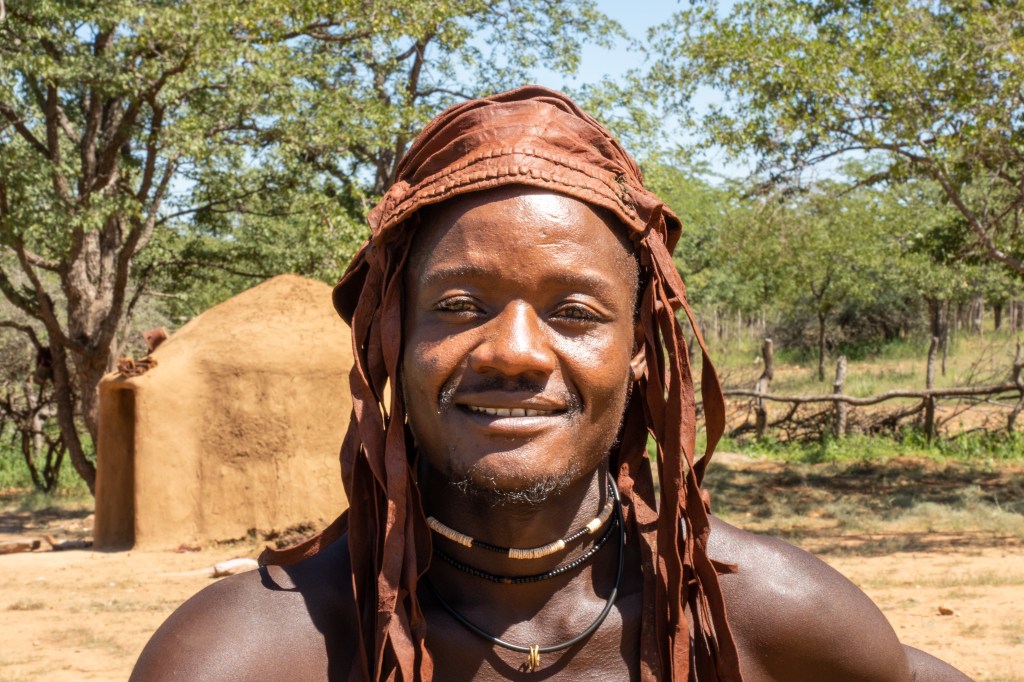 Die Lösung ist ein „Ovahimba living museum“ … ein lebendes Himba Dorf Museum. Wir folgen dem schmalen Sandpfad bis zum Eingang des Dorfes und werden von einem jungen Mann (Meteorologie Student aus Windhoek) begrüsst und verhandeln kurz, welche Dorftour wir machen wollen. Eine kleine Runde durchs Dorf, einen Himba-Kosmetik Workshop, Tanzunterricht oder eine Hochzeitszeremonie stehen zur Auswahl … wir wählen die kleine Dorfrunde mit Erklärungen zum Dorfleben.