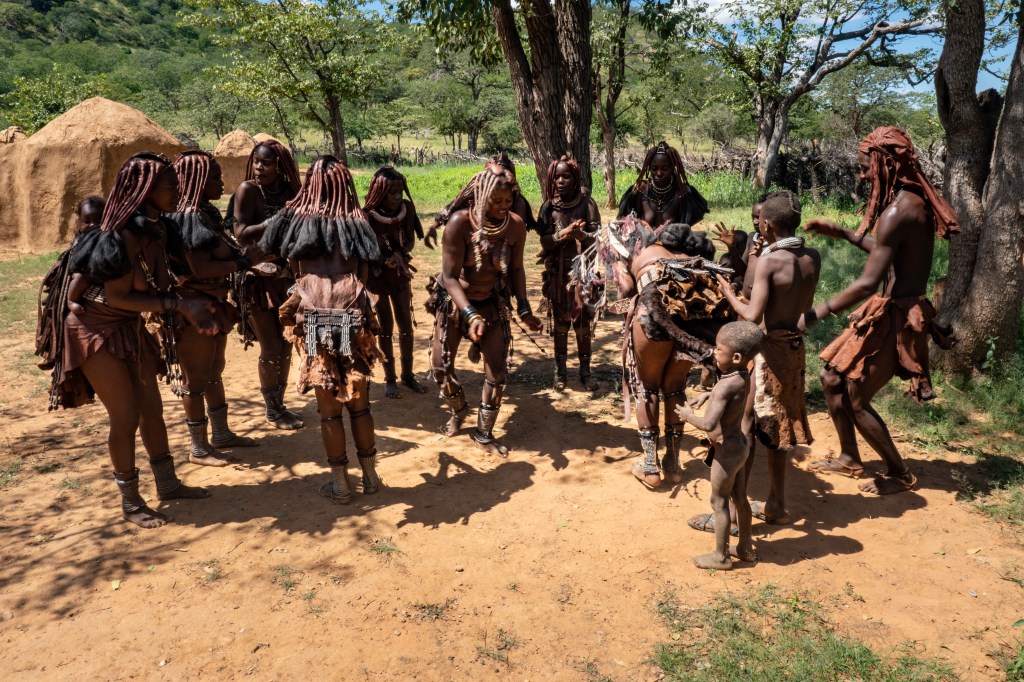 Alle Männer haben mit dem Vieh, meist Rinder und Ziegen, das Dorf verlassen … bis auf einen, der auf die Frauen aufpasst. Das Dorf ist rund angelegt mit einem Durchmesser von 100 Metern. In der Mitte befindet sich ein Kral, ein eingezäunter Bereich, in dem am Abend die Tiere untergebracht werden. Ringsherum stehen kleine runde Hütten aus Holz und Lehm. Die grösste Hütte hat eine quadratische Grundfläche und dient dem Oberhaupt des Dorfes und Zeremonien. Unmittelbar davor brennt das ewige Feuer, dass nie erlöschen darf. Wir probieren den Hirsebrei mit Ziegenmilch … sauer und schwer geniessbar … und sehen bei der Zubereitung der Kosmetik zu. Die Himbas mit tiefschwarzer Hautfarbe tragen eine rötliche Paste auf, die mit Fett, Kräutern, rotem Steinsalz und Asche erzeugt wird und die Haut vor den Umwelteinflüssen (Sonne, Hitze, Kälte) schützt. Die halbnomadisch lebenden Himbas tragen als Kleidung einen Lendenschurz (Männer) oder bunte Gürtel um die Hüften (Frauen) und sonst nix mehr. Zum Schluss des Rundganges wird dann noch getanzt und sowohl Conny wie auch Sebastian können die Beine nicht still halten und tanzen „ekstatisch“ mit 🙂