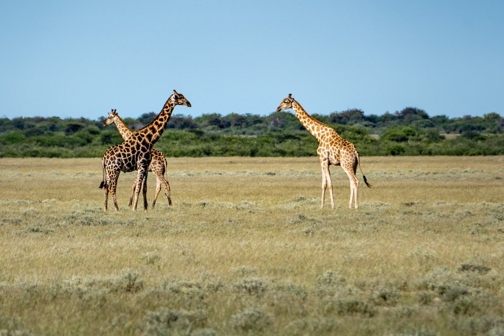 Die Nacht dürfen wir in einem richtigen Bett verbringen, in einem Stein-Bungalow und wir werden bekocht … eine willkommene Abwechslung zum Camper Leben. Die Uukwaluudhi Lodge haben wir für uns allein und wir geniessen den Pool, den Sonnenuntergang auf dem Lodge Deck und den morgendlichen Game Drive in den Busch. Wir bewundern Oryx Antilopen; Zebras galoppieren in grossen Gruppen durch die Savanne, finden die Spuren einer Hyäne und zum Schluss grüsst uns eine Giraffen Herde.
