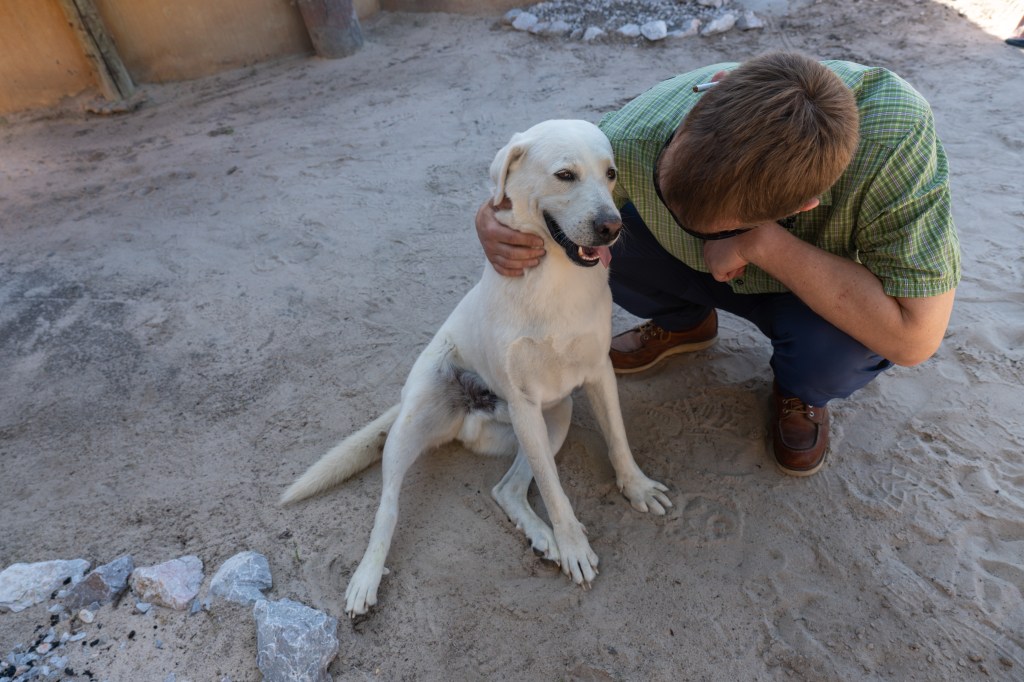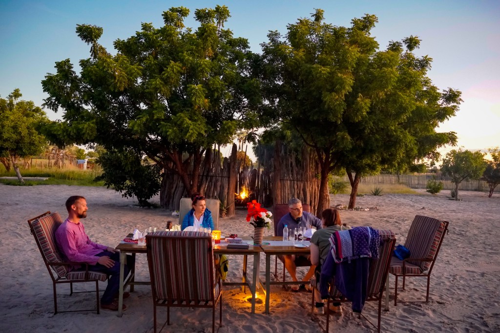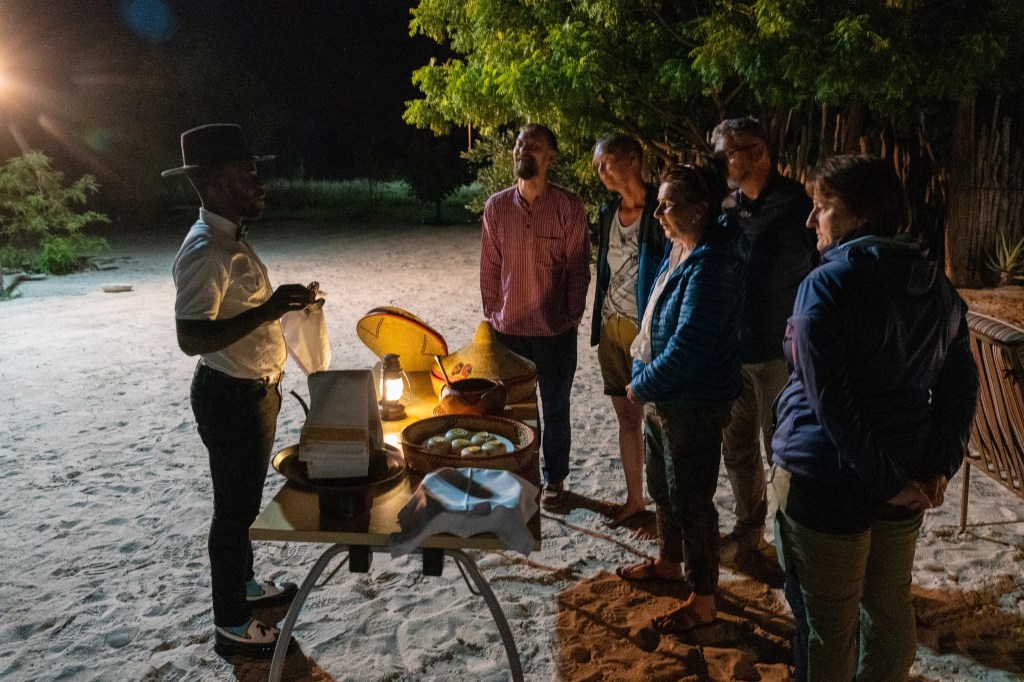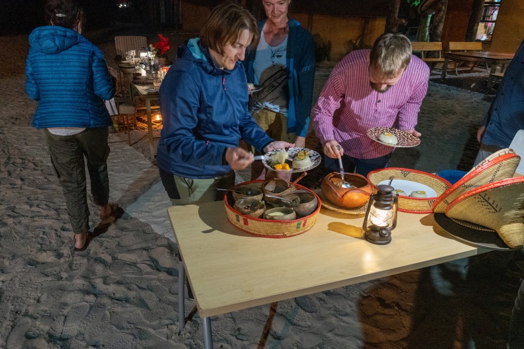 … und sie geben sich so viel Mühe mit uns. Auf einem sandigen Platz unter dem freien Himmel wurden zwei Tische festlich eingedeckt. Bequeme Sessel stehen bereit und im Kral knistert ein Feuerchen. Wir geniessen als Starter einen köstlichen Hirsesalat und trauen uns neben dem scharfen Hühnchen, auch die Mapone Würmer und den Hirsepapp zu probieren. Dazu gibt es noch wilden Spinat, Kürbis und scharfe Bohnen.